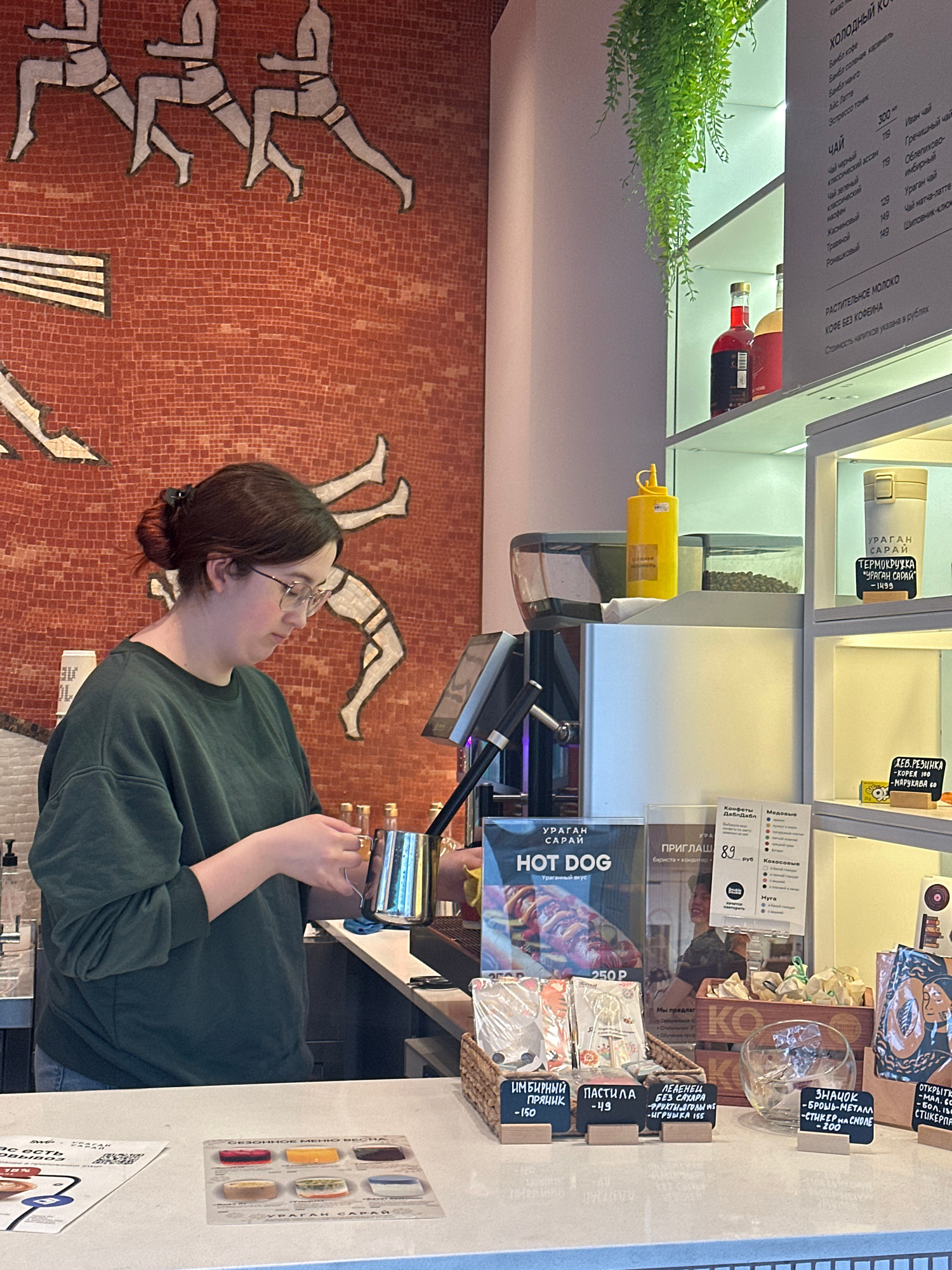 A young woman with glasses is standing at a counter in a cafe. She is wearing a dark green sweatshirt. The cafe has a mosaic wall depicting human figures, and the counter displays a menu board, a hot…read more
