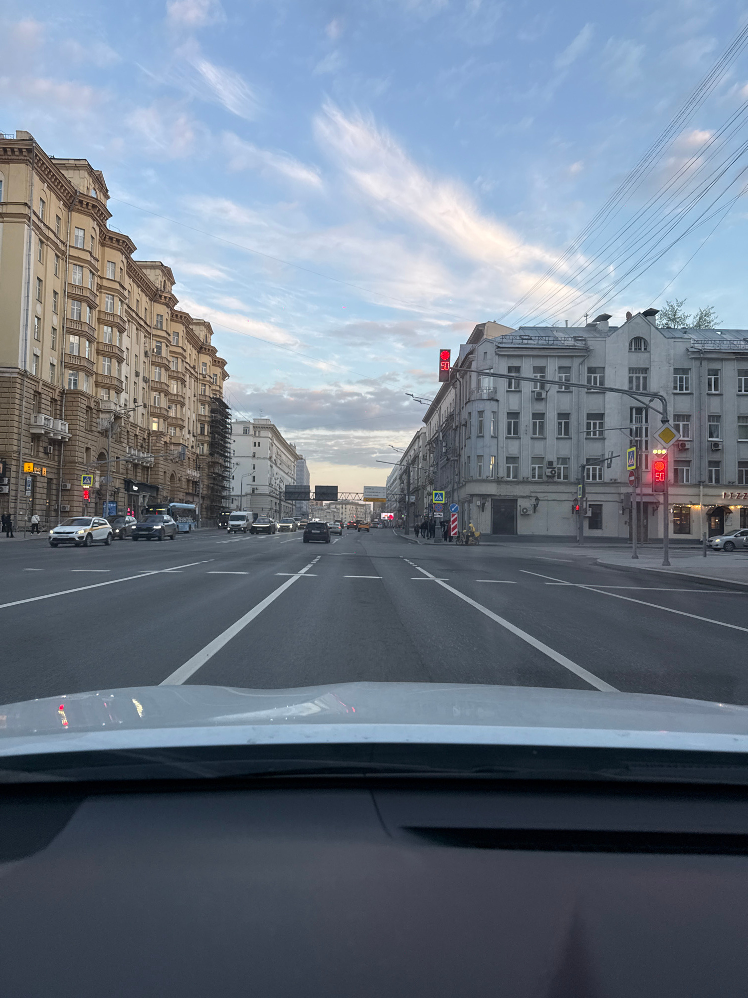 The image shows a street scene in Moscow, Russia. The view is from inside a vehicle, looking down a wide avenue lined with buildings of various architectural styles. The sky is partly cloudy. Traffic…read more
