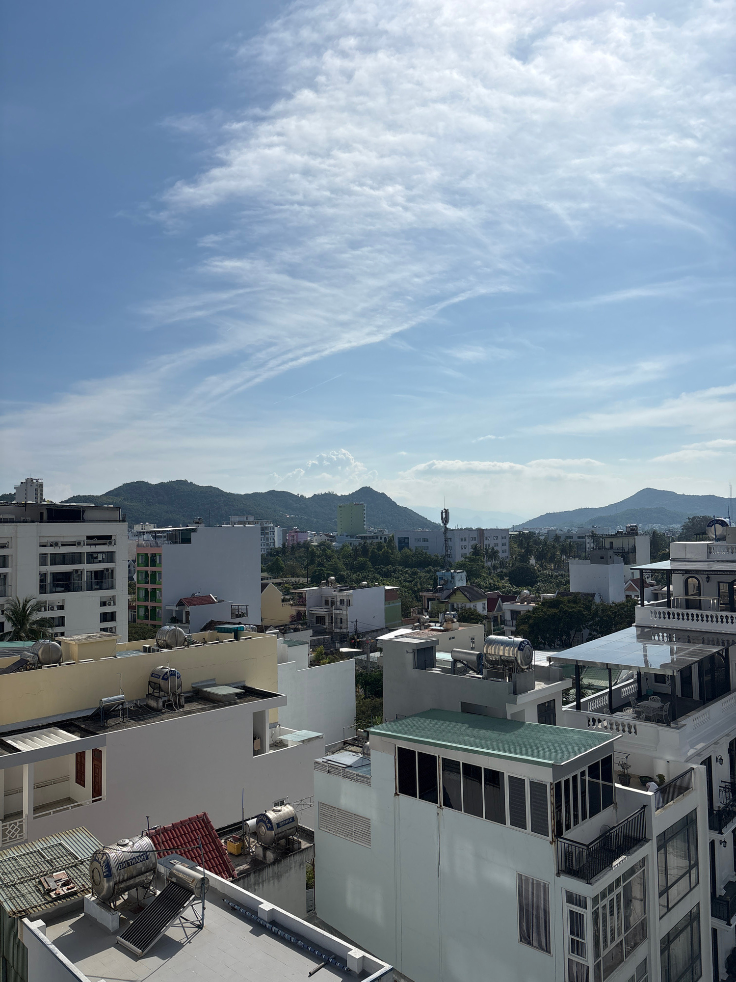 This is a high-angle, daytime view of Nha Trang, Vietnam, looking from a building across the city. Mountains are visible in the distance, separating the sky and the urban landscape. The sky is partial…read more