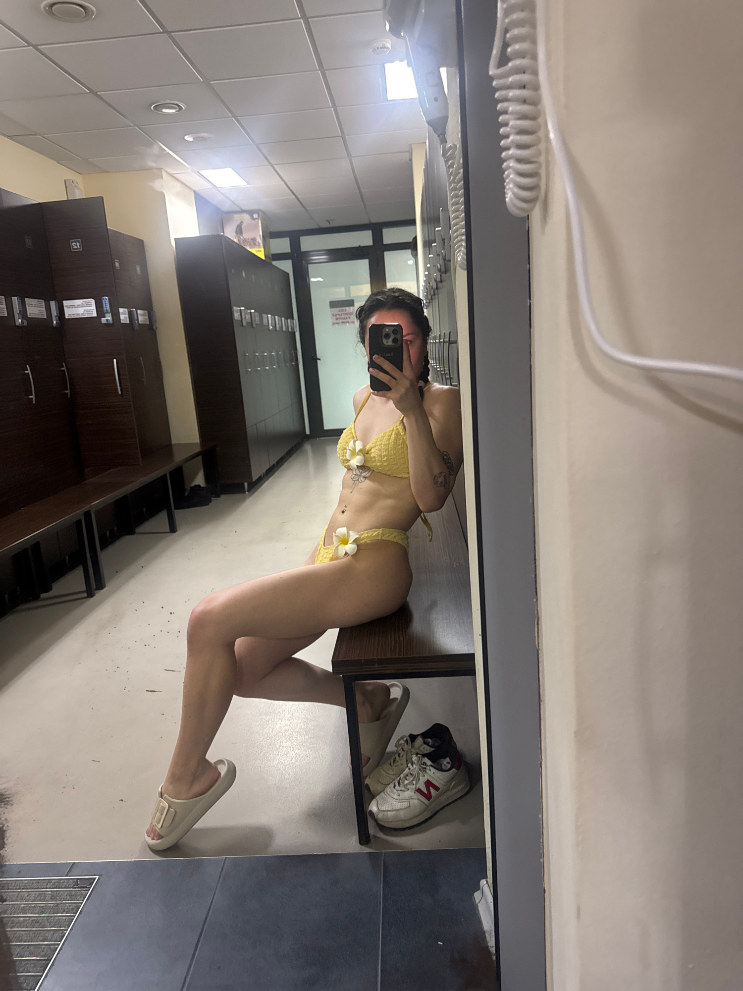 A person is taking a selfie in front of a mirror in a room with lockers and cabinets. The person is wearing a yellow bikini with flower embellishments and slides. The location is identified as Burgas,…read more
