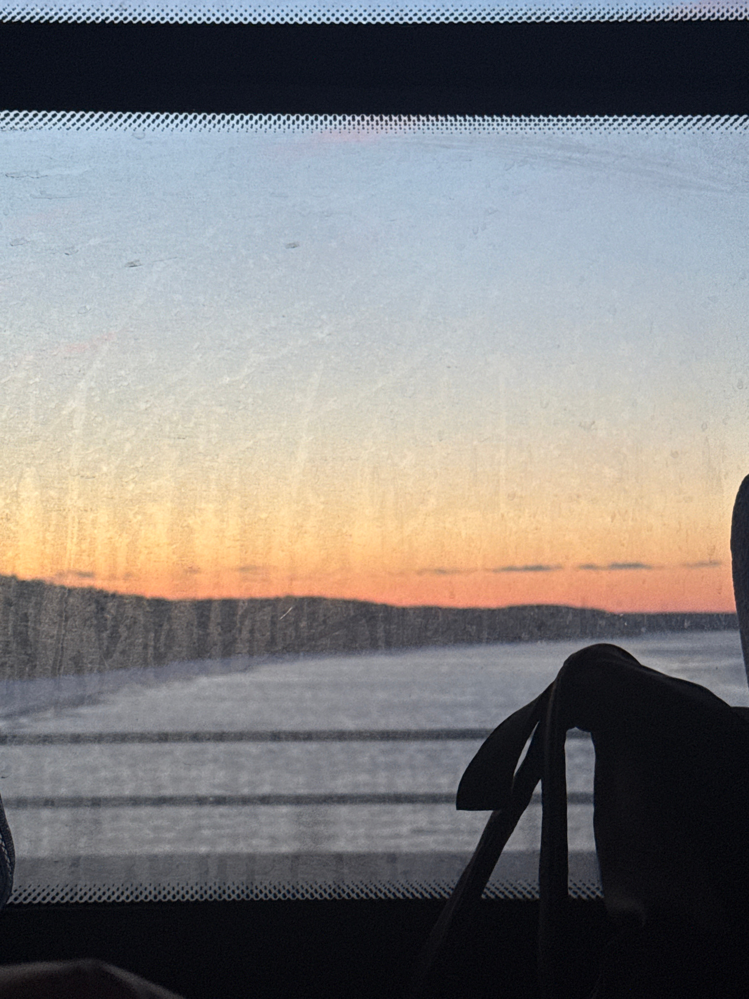 The image shows a view through a window, likely a car windshield, with an obscured view of what appears to be a body of water, possibly a river or lake, at sunset. The sky exhibits colors ranging from…read more