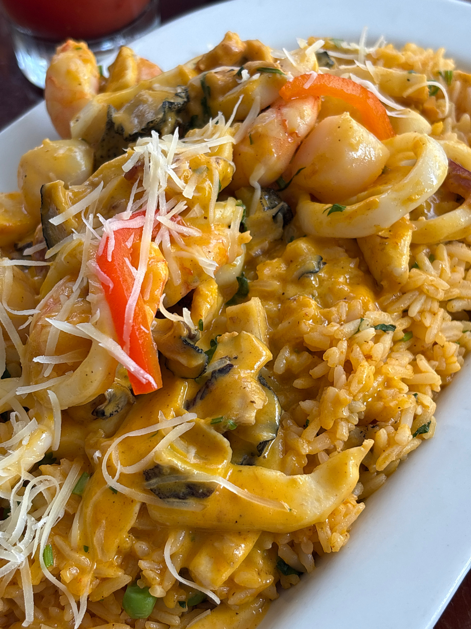 The image shows a close-up of a plate of seafood rice, likely risotto. The dish includes rice, shrimp, mussels, squid rings, scallops, and slices of red bell pepper. A light-colored shredded cheese isβ¦read more