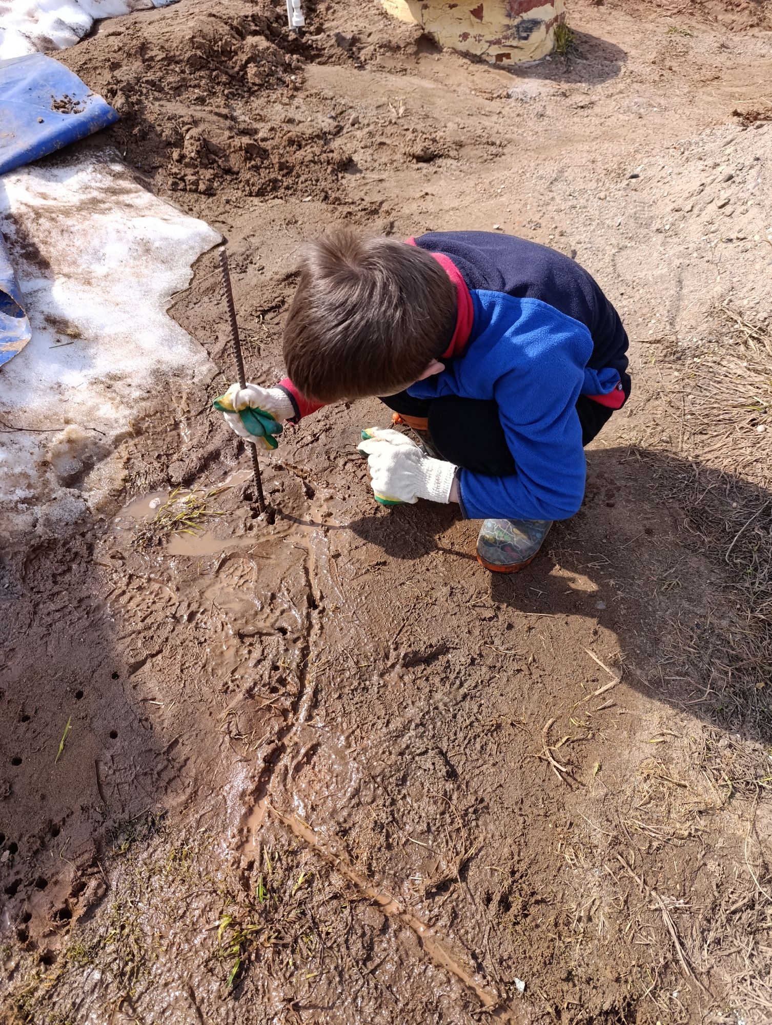 An outdoor scene in Chaikovsky, Russia, depicts a child squatting down and engaging with a muddy patch of ground under bright daylight. The child, seen from an elevated perspective, is wearing a blue…read more