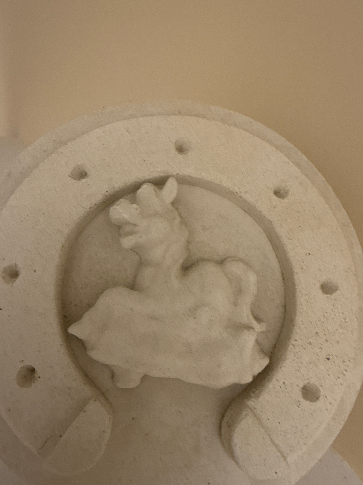 A close-up photograph depicts a stone horseshoe with a raised, abstract figure inside. The horseshoe has a series of small holes around its perimeter. The entire sculpture is a light-colored stone. Ba…read more