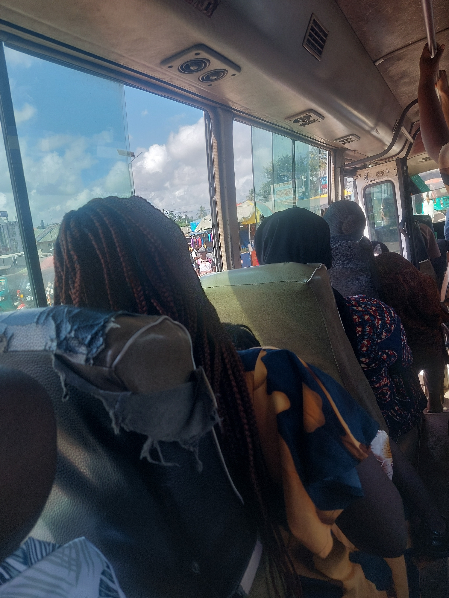 The image depicts the interior of a public transport vehicle, likely a bus or mini-bus, seen from a passenger's perspective looking forward and towards the side windows. The overall scene suggests a b…read more