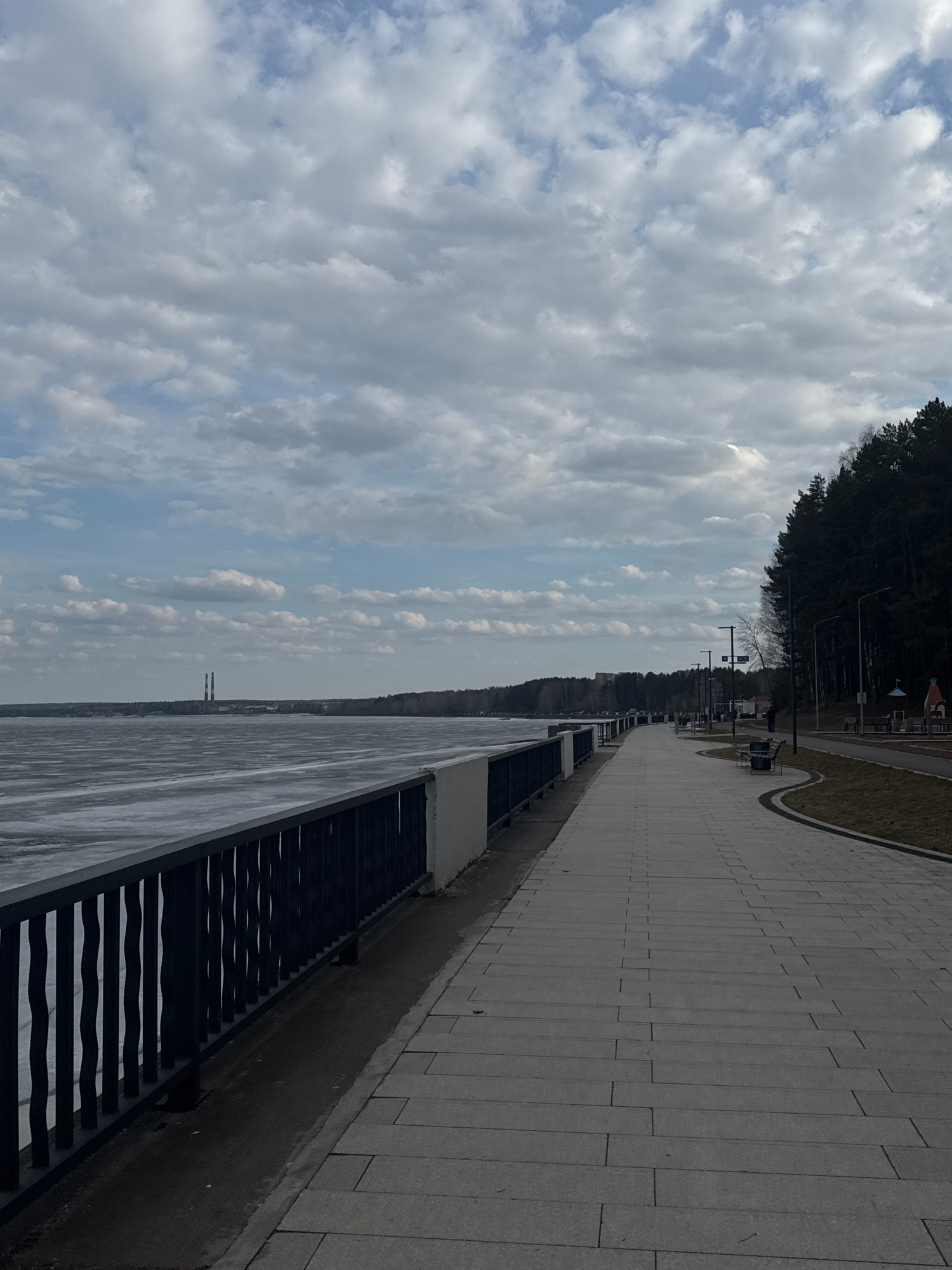 The image displays a waterfront embankment and pathway under a partly cloudy sky, likely in Chaikovsky, Russia. The perspective is from an elevated position looking parallel to the water. In the uppe…read more