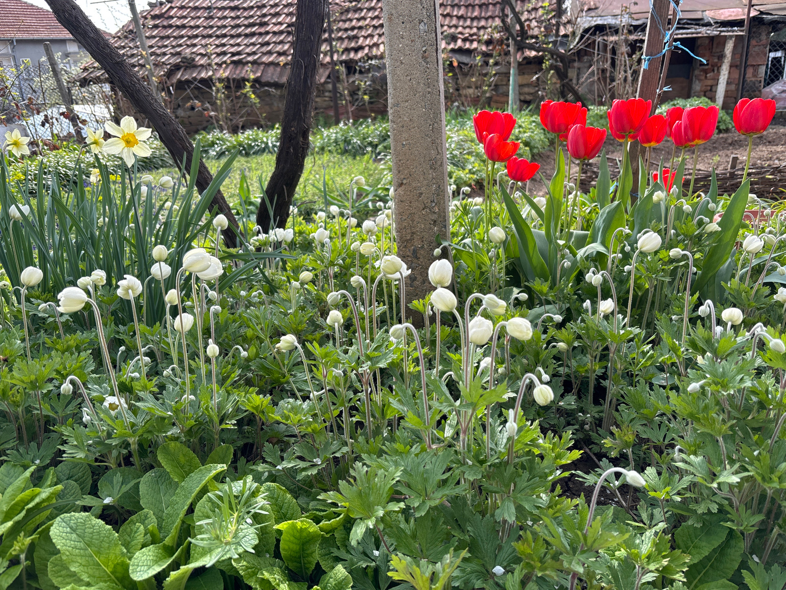 The image depicts a garden scene in Lovech, Bulgaria, featuring a variety of flowers. Predominantly, there are numerous white anemones with closed buds and green foliage. Interspersed among them are r…read more