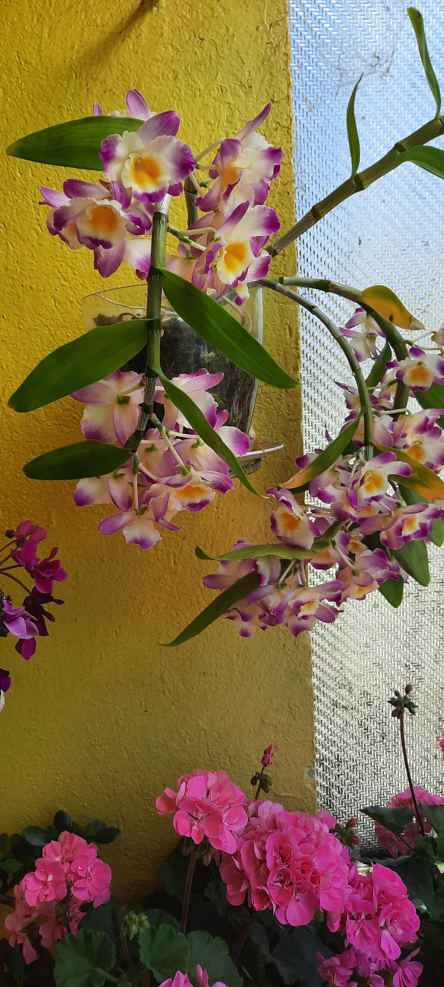 The image shows a cluster of purple and white orchids with yellow centers. The flowers are attached to a green stem and surrounded by long, green leaves. To the right of the orchids are pink geraniums…read more