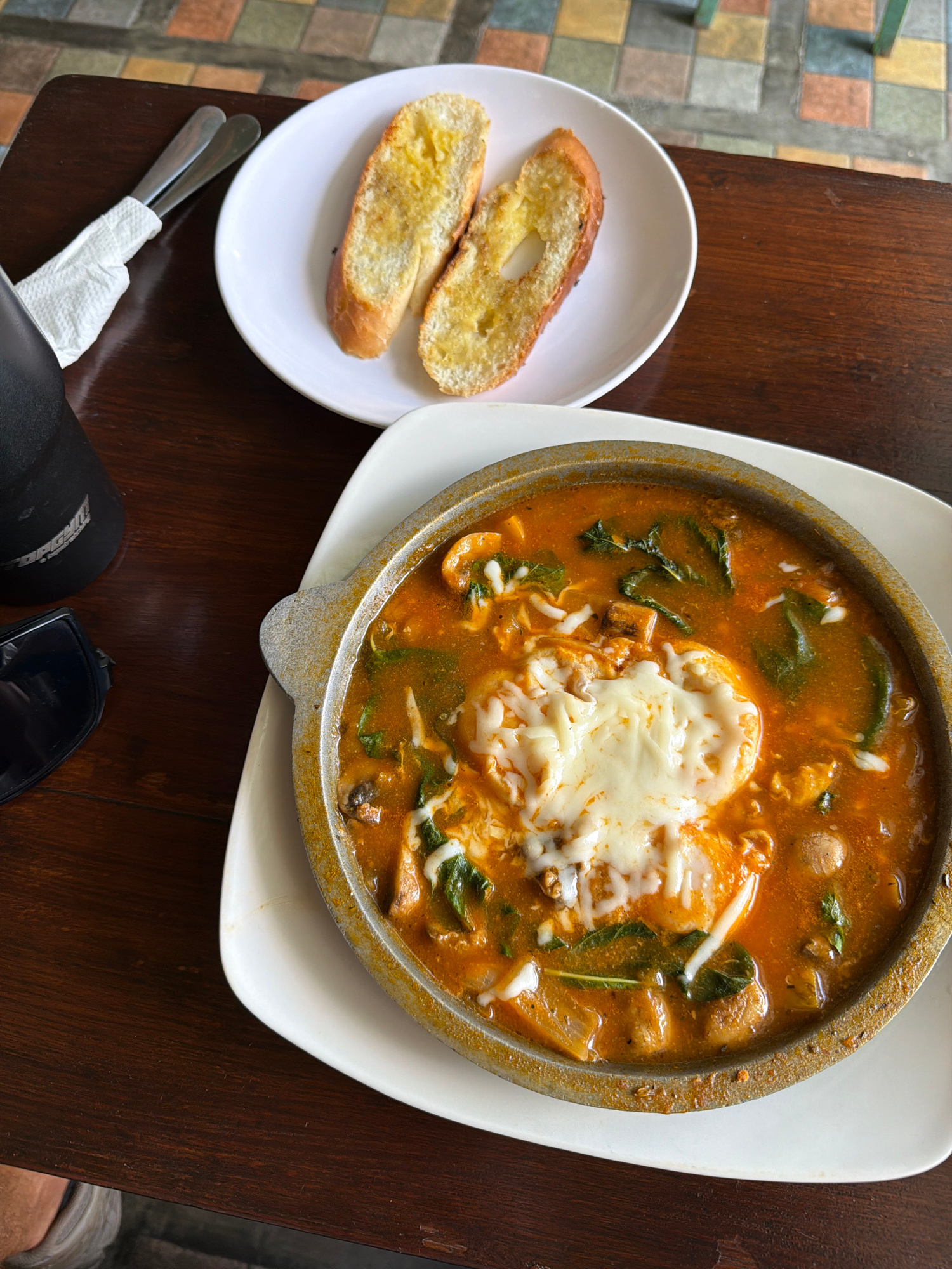 A top-down, medium shot captures a meal at an outdoor setting in North Kuta, Indonesia. A dark wood table is the backdrop. A round, cast-iron pot filled with a reddish-orange soup occupies the upper r…read more