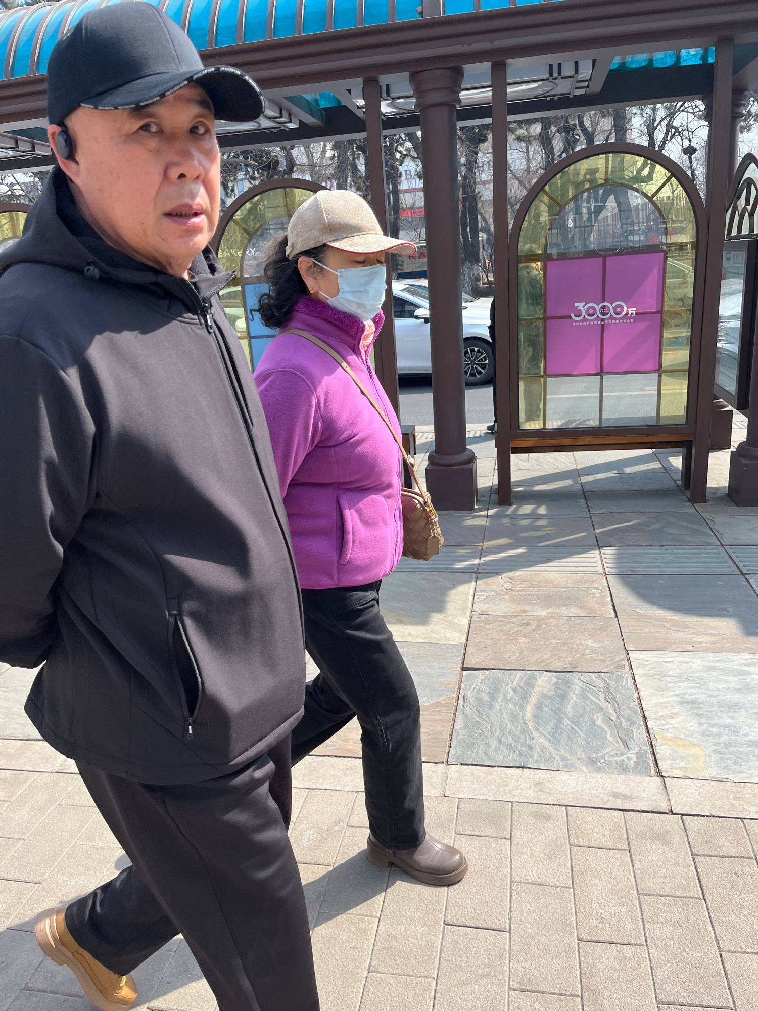 In Changchun City, China, a man and woman are walking along a paved walkway near a bus stop. The man is wearing a black baseball cap and a black jacket. The woman is wearing a pink jacket and a beige…read more