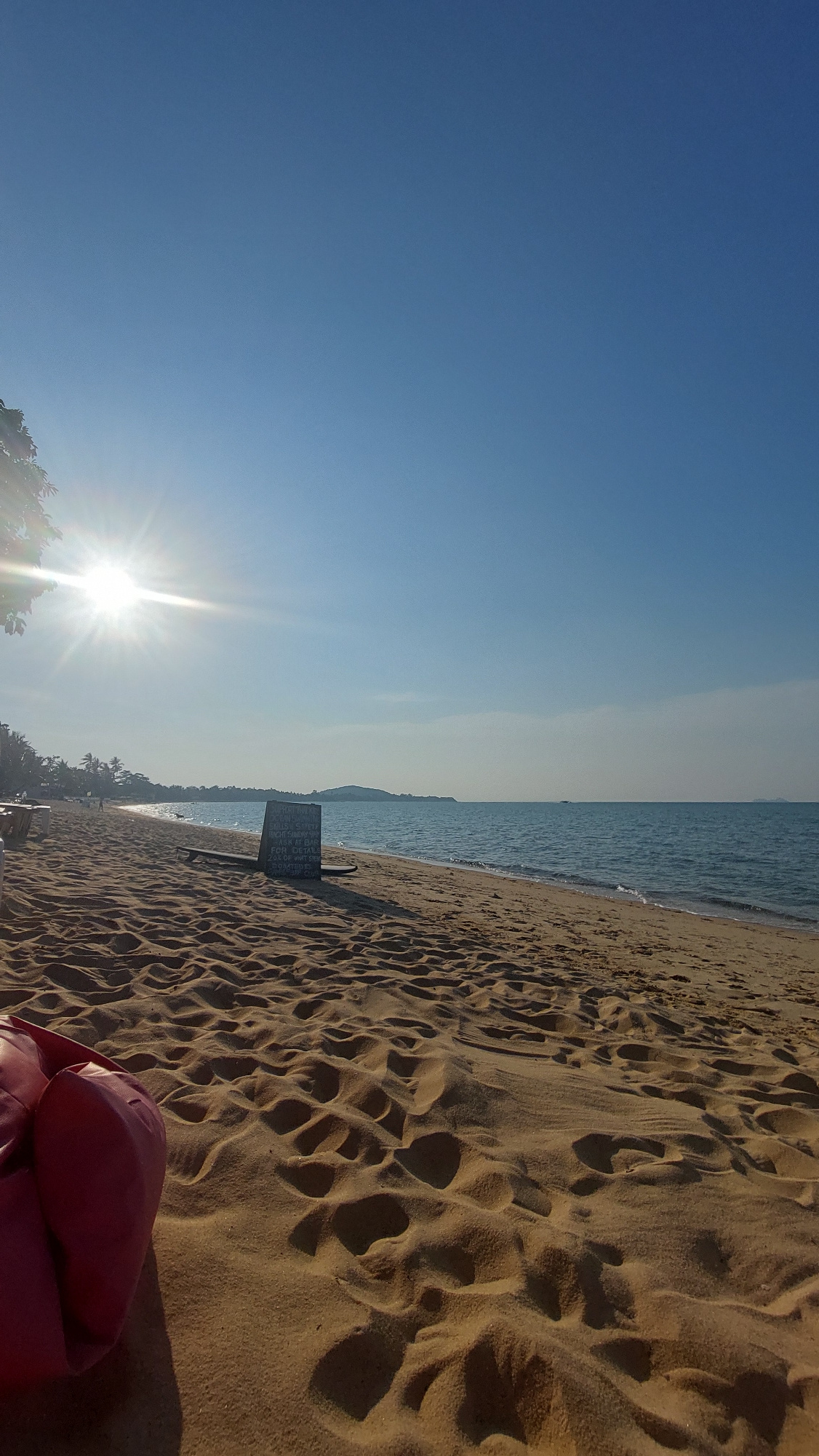 This image captures a bright, sunny beach scene, likely in Baan Mae Nam, Thailand, presented with a vertical orientation. The clear blue sky occupies the entire left side, with a brilliant sunburst em…read more