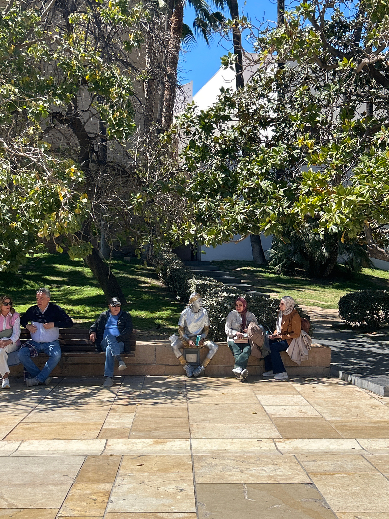 A photograph depicts a park in Málaga, Spain, showcasing people seated on benches and walking around. In the foreground, light-colored stone pavement is visible. Benches are arranged in a row on the l…read more