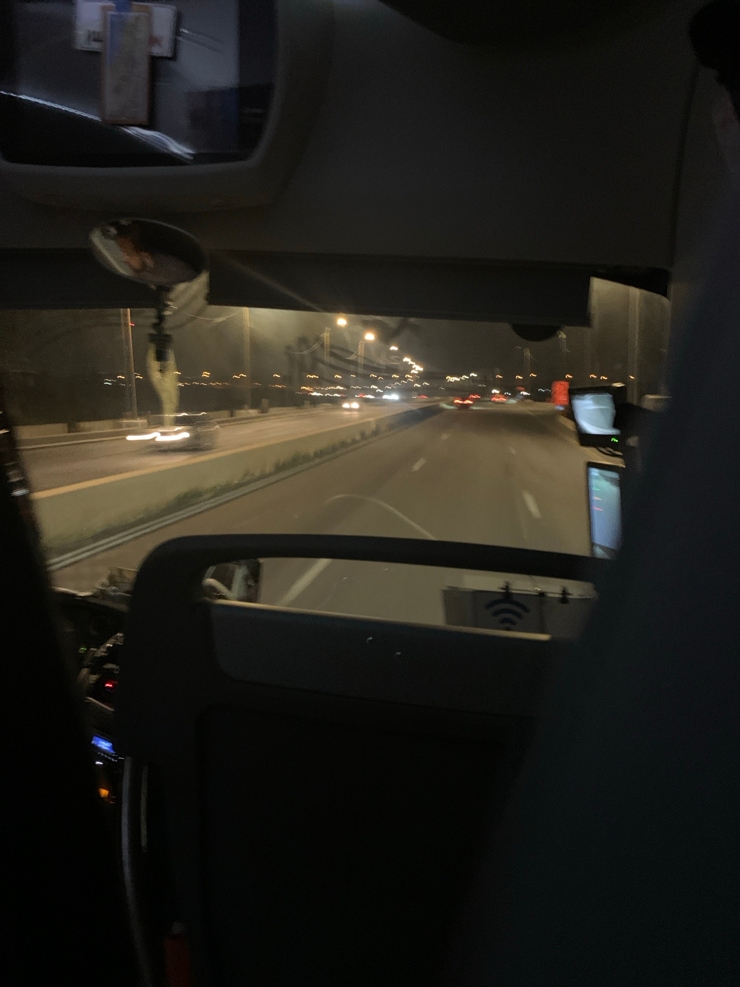 The image depicts a view from inside a vehicle, possibly a truck, at night. The vehicle appears to be on a highway with heavy traffic, indicated by the blurred streaks of headlights and taillights of…read more