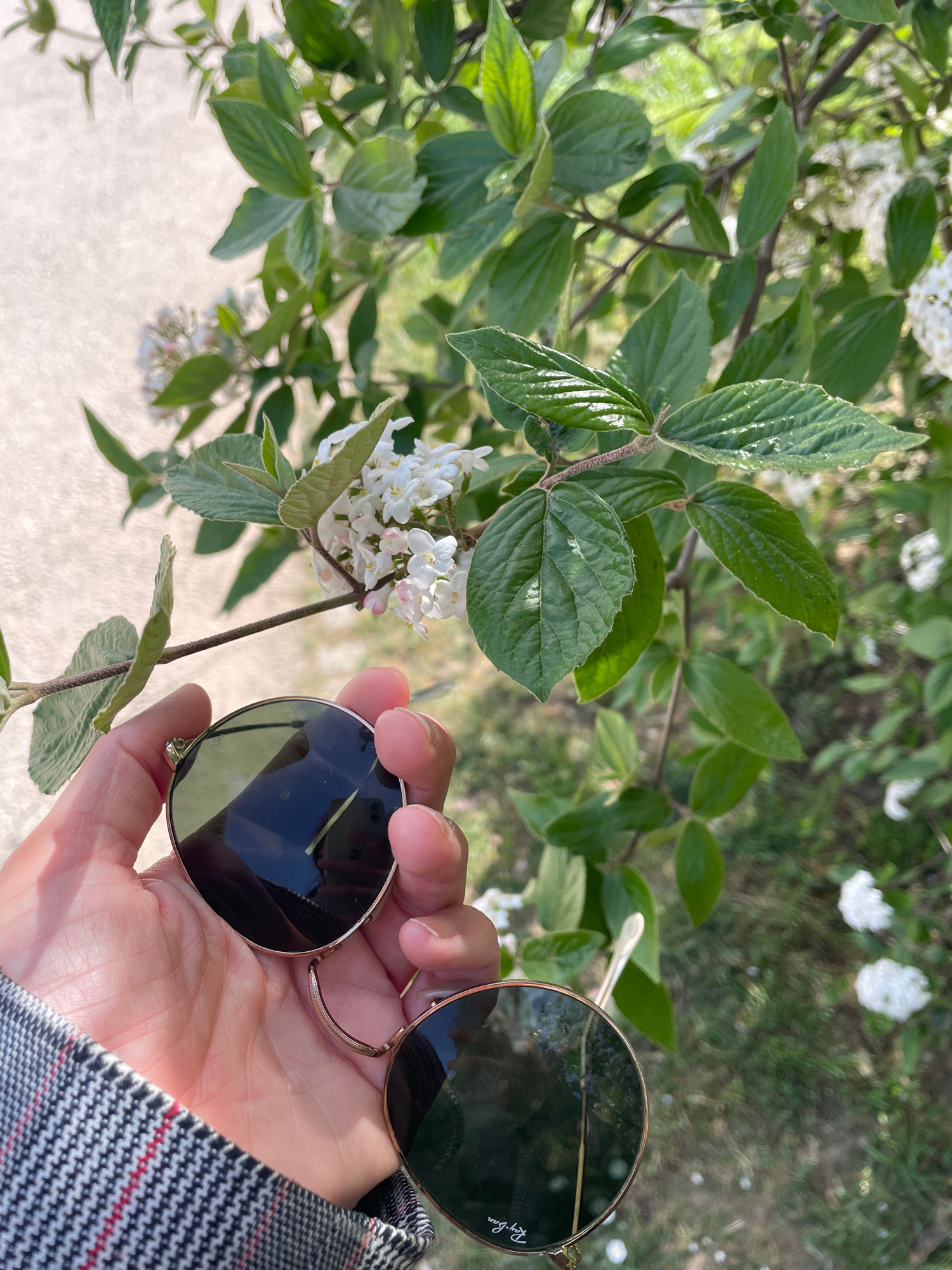 The image shows a hand holding a pair of Ray-Ban sunglasses in front of a flowering shrub. The shrub has dark green leaves and clusters of small white flowers. The person's hand is pale, and they are…read more