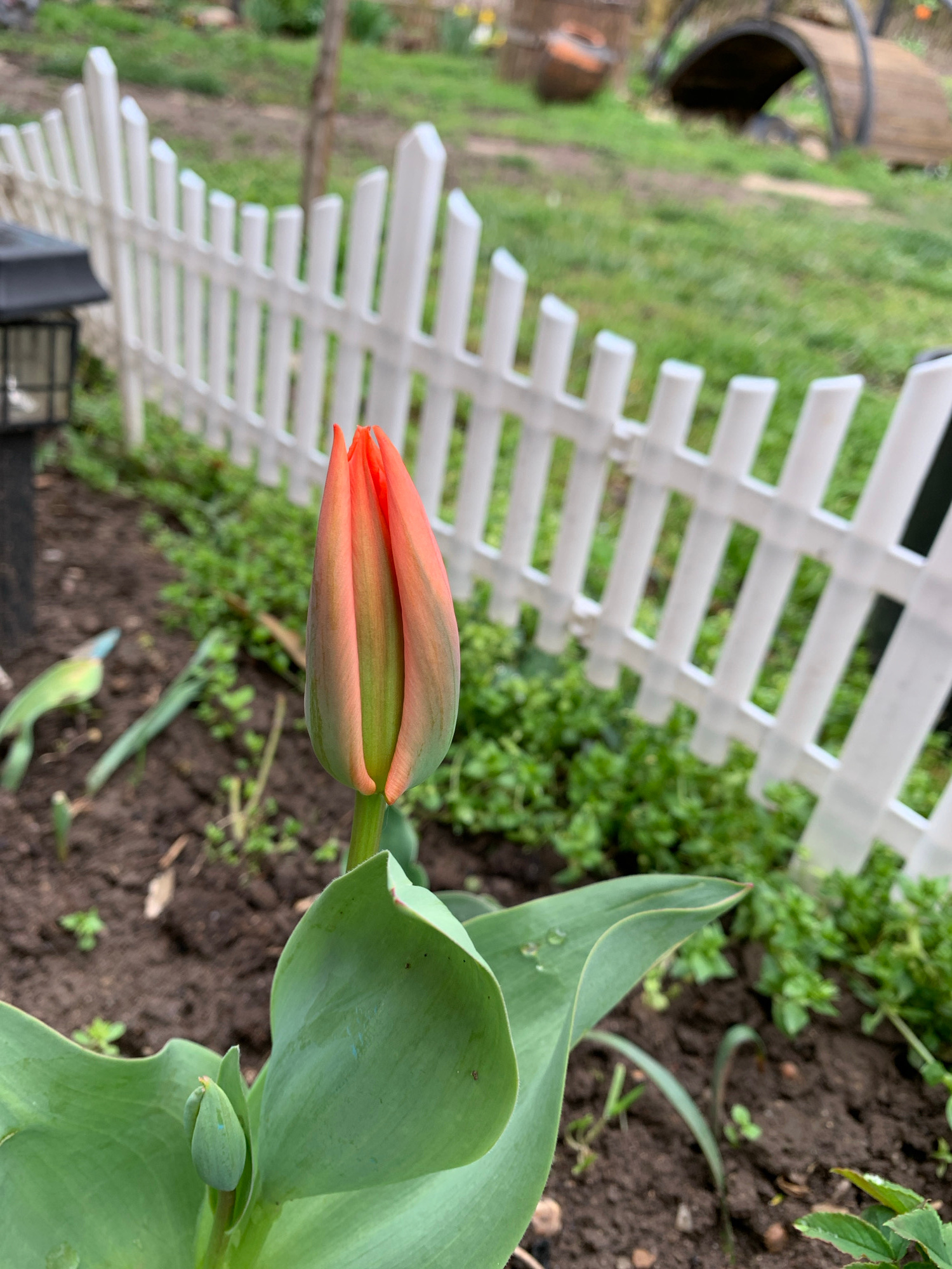 A close-up, slightly rotated image features a tulip bud with orange and green hues, positioned in front of a white picket fence. The tulip is partially opened, revealing glimpses of the orange petals…read more