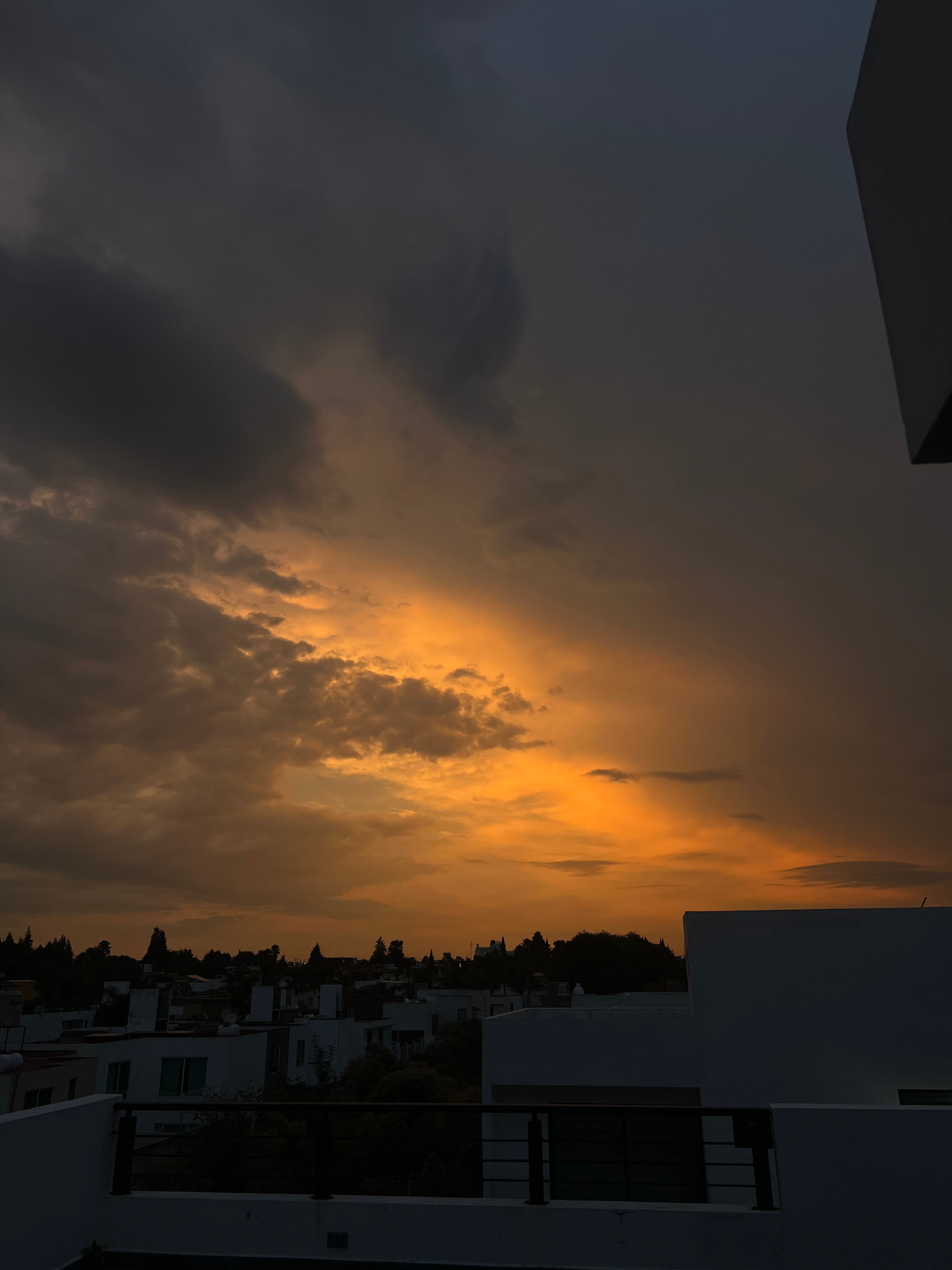 The image shows a view in Cholula, Mexico, at twilight. The sky is filled with dark clouds illuminated by a vibrant orange-yellow light near the horizon, presumably from the setting sun. A cityscape o…read more