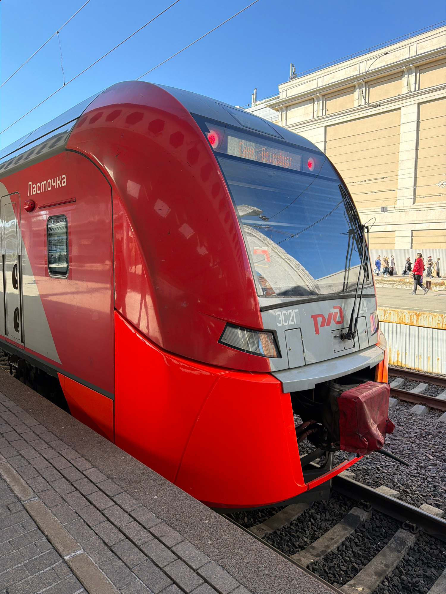 A red train sits at a station platform, facing the right side of the frame. The train car is marked with Cyrillic text. Above the train is a concrete building with a blue sky in the upper-left corner…read more