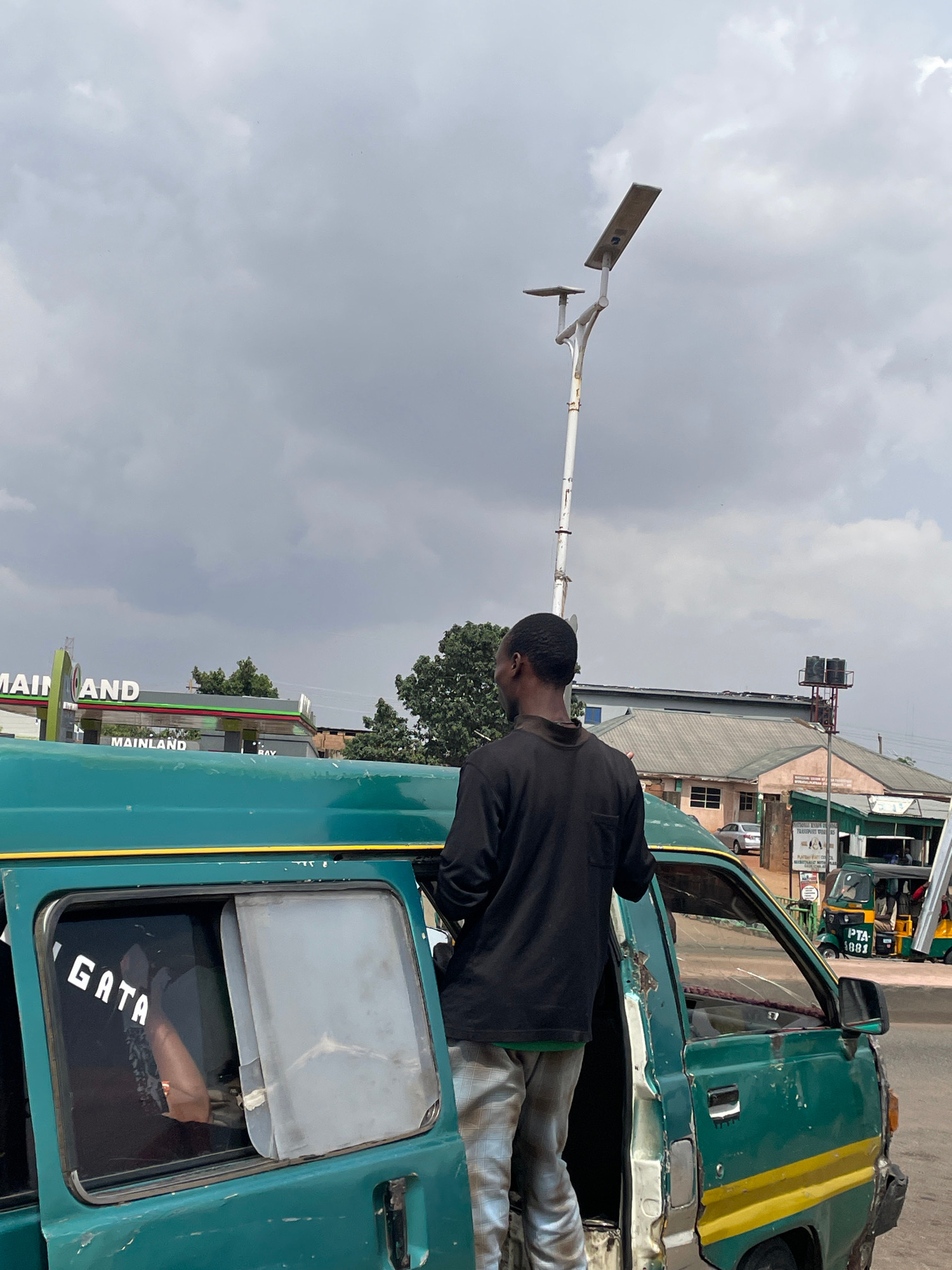 A medium-level, outdoor shot depicts a man standing in the open doorway of a green vehicle. He is wearing a black long-sleeved shirt and light-colored pants. The vehicle appears to be a commercial tra…read more