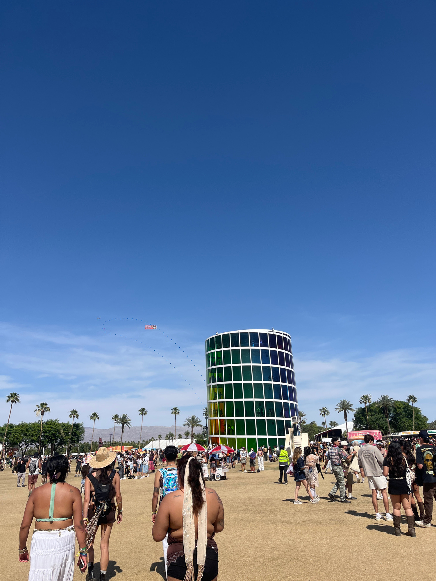 The image depicts a daytime scene in Indio, United States of America. The sky is predominantly blue, taking up approximately half of the image. The right side of the image shows a crowd of people. A l…read more