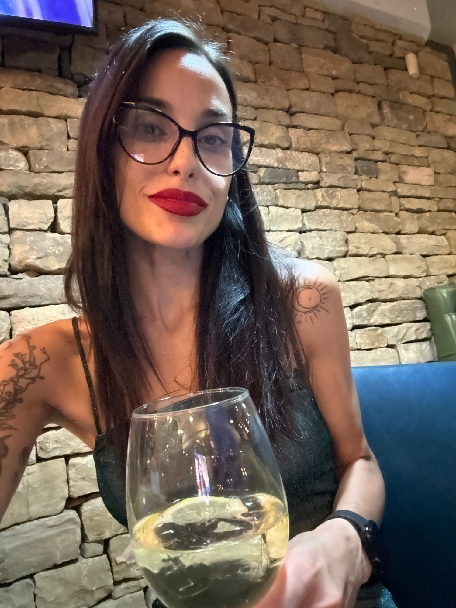 A woman is holding a glass of liquid while facing the camera. She is wearing glasses and red lipstick, and has tattoos on her arms. The background is a brick wall. Based on the location and the availa…read more