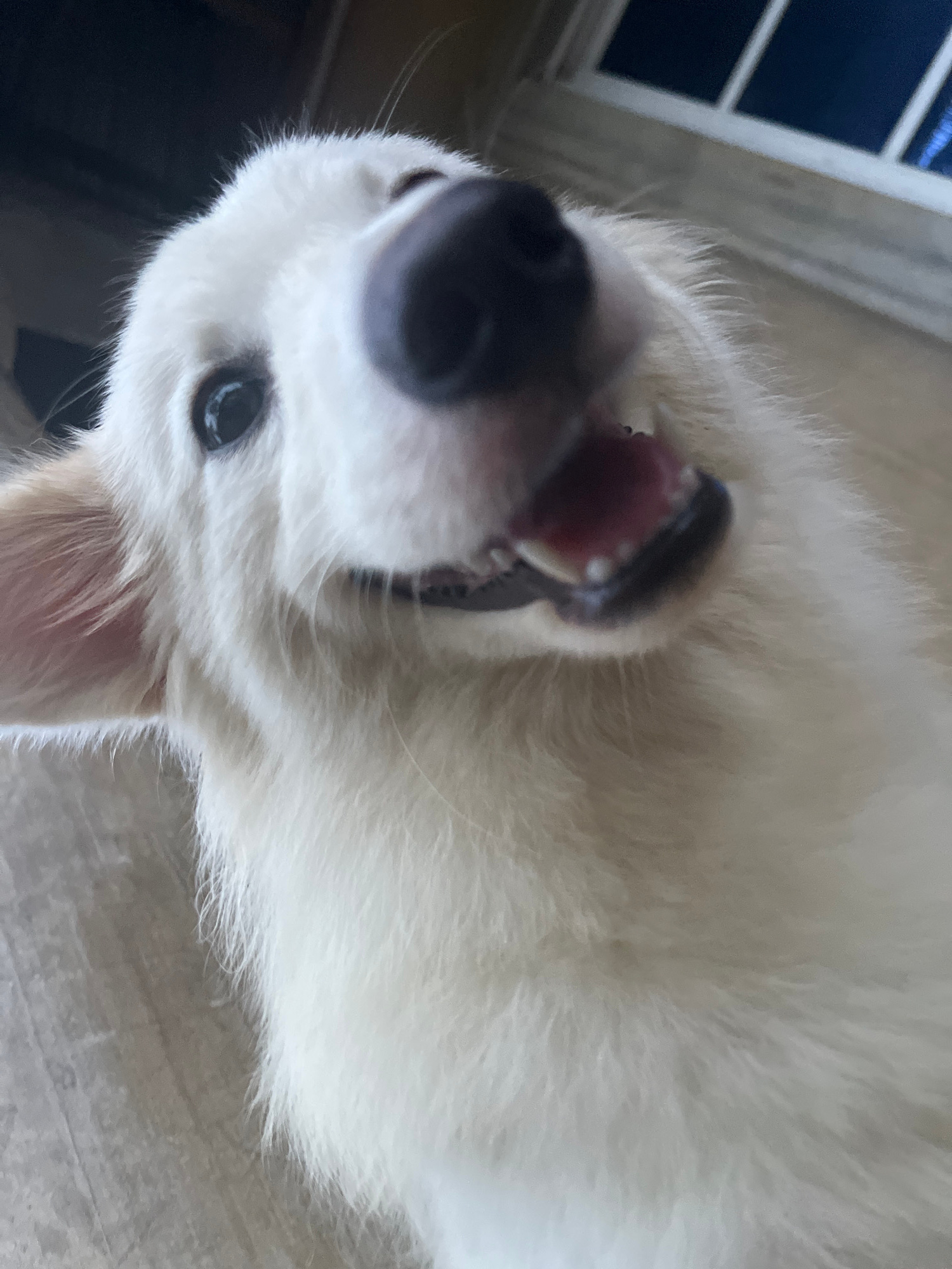 The image shows a white dog lying on its back. The dog's mouth is open, revealing its teeth and tongue. The dog has a black nose and one visible eye. A window is visible in the background. The locatio…read more