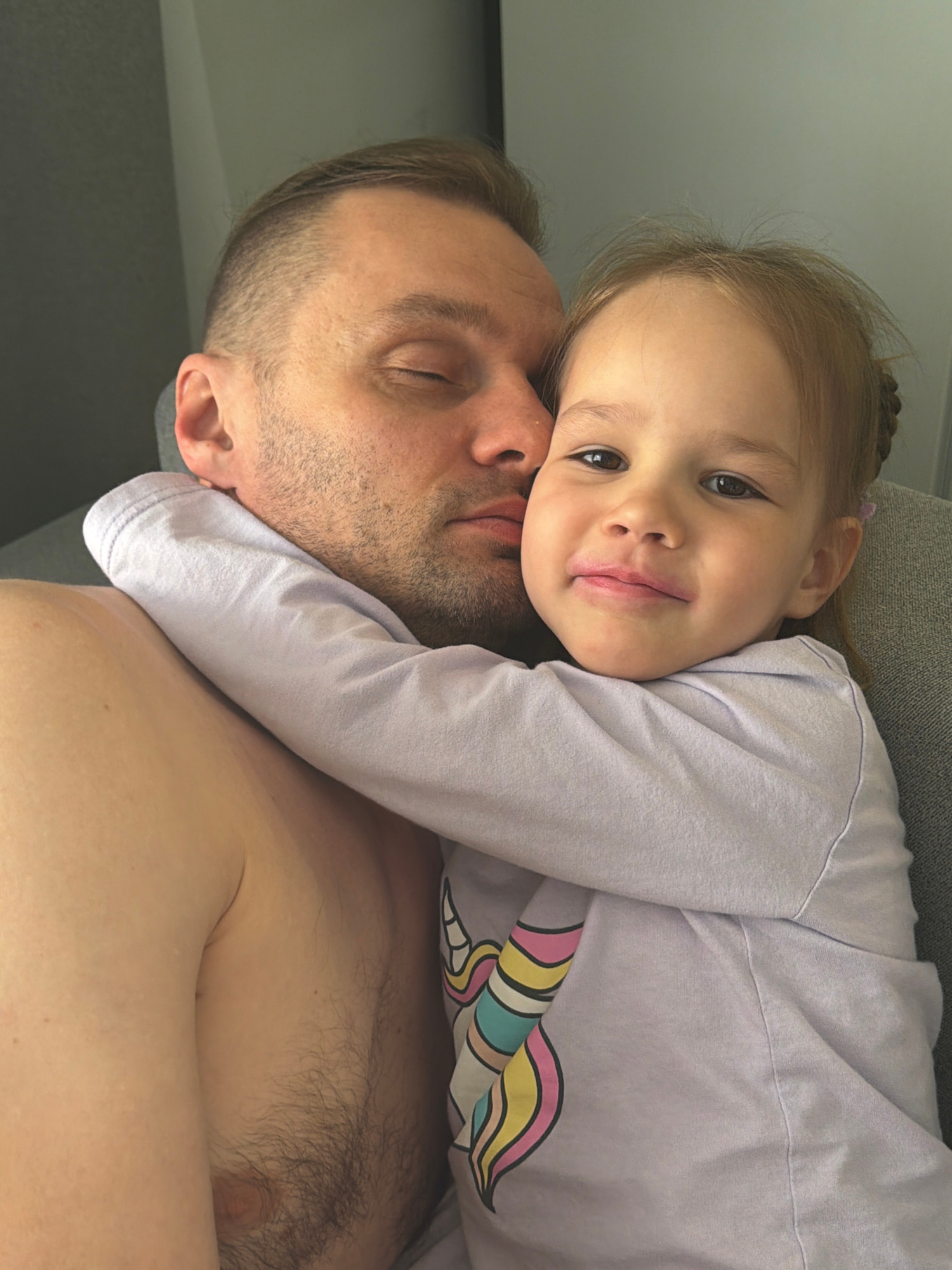 A slightly high-angle medium indoor shot shows a fair-skinned adult male with dark blonde hair and a fair-skinned young female with light blonde hair. The male's right eye is closed. His face is slighβ¦read more