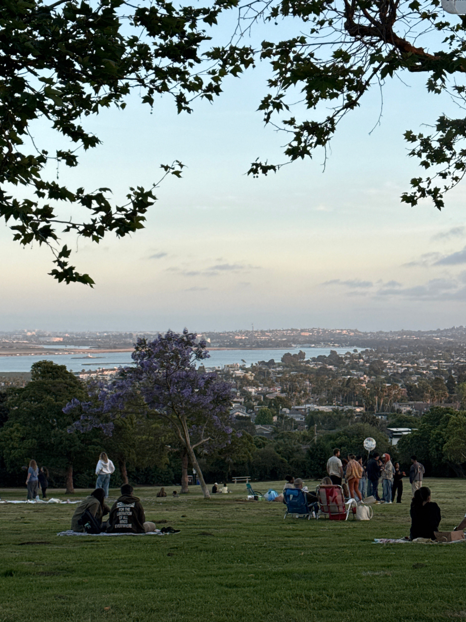 A landscape scene shows a view from a grassy hill. People are arranged on the grass, sitting in chairs or on blankets. A body of water divides the land with a city on both sides. Green foliage lines t…read more