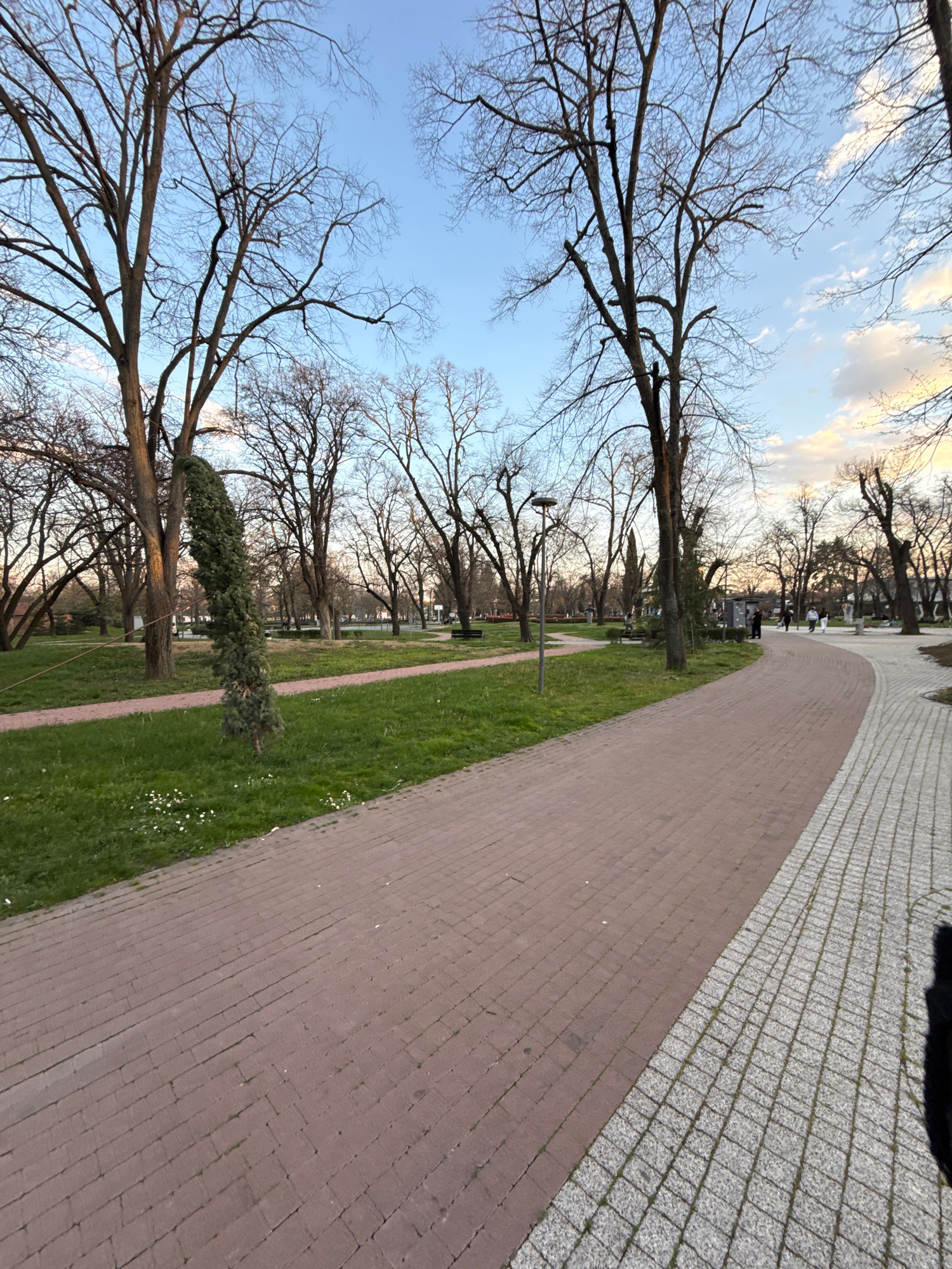 The image shows a park pathway in Stara Zagora, Bulgaria. The pathway is constructed of two different types of brick: a reddish-brown rectangular brick and a gray square brick. A strip of green grassβ¦read more