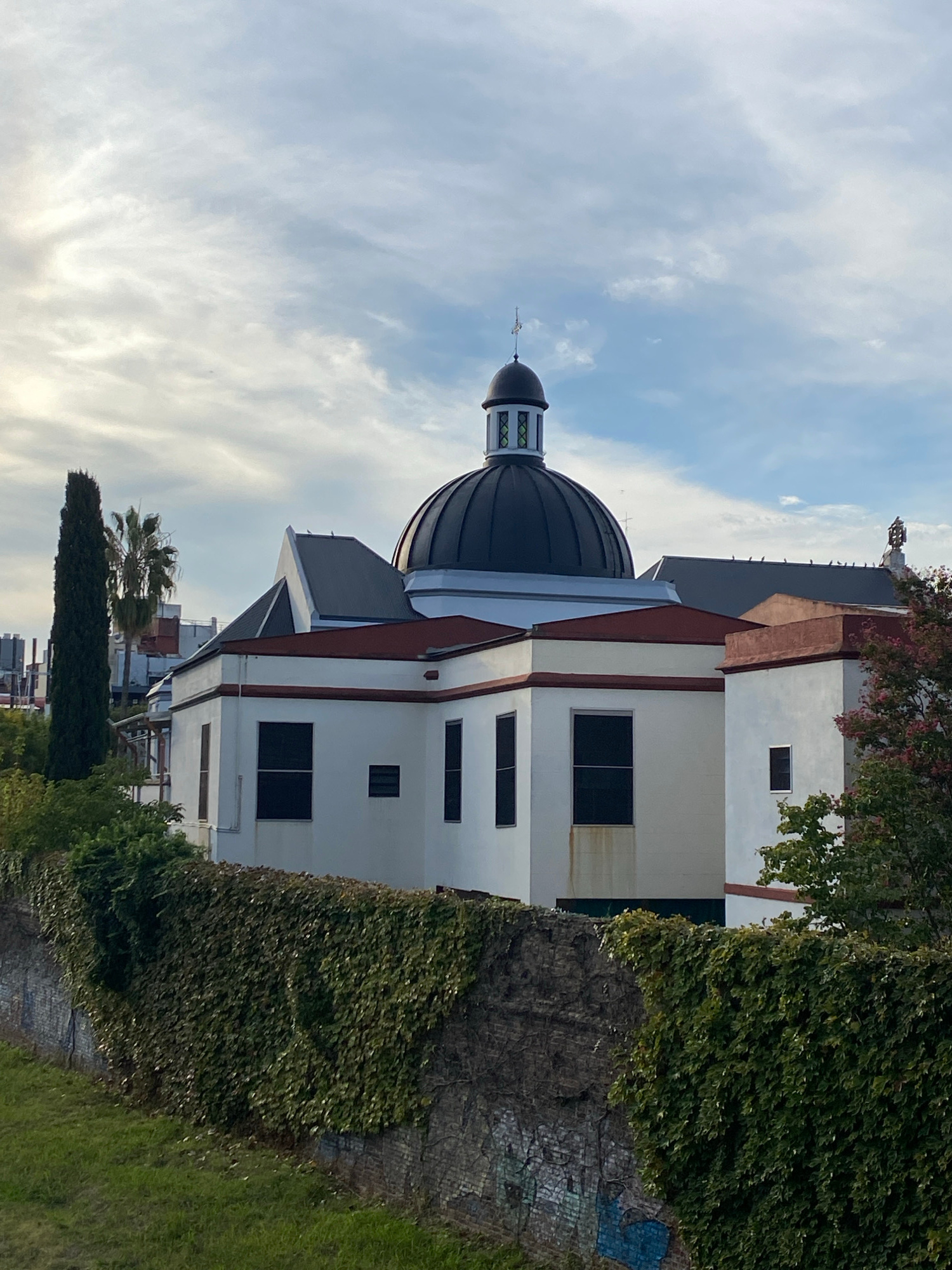 The image shows the Basílica del Santísimo Sacramento in Buenos Aires, Argentina. The Basilica is a white building with a dark dome, red trim and dark-paned windows. It appears to be a cloudy day, as…read more