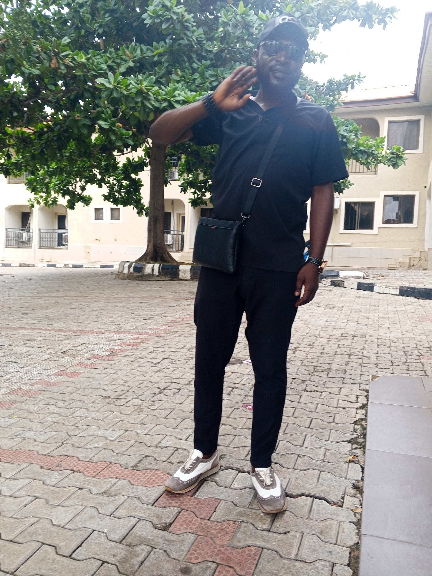 A man stands outdoors on a paved surface. He is wearing a black t-shirt, black pants, a black cap, and sunglasses. A black bag hangs across his shoulder. His left hand is raised, as if waving or salut…read more