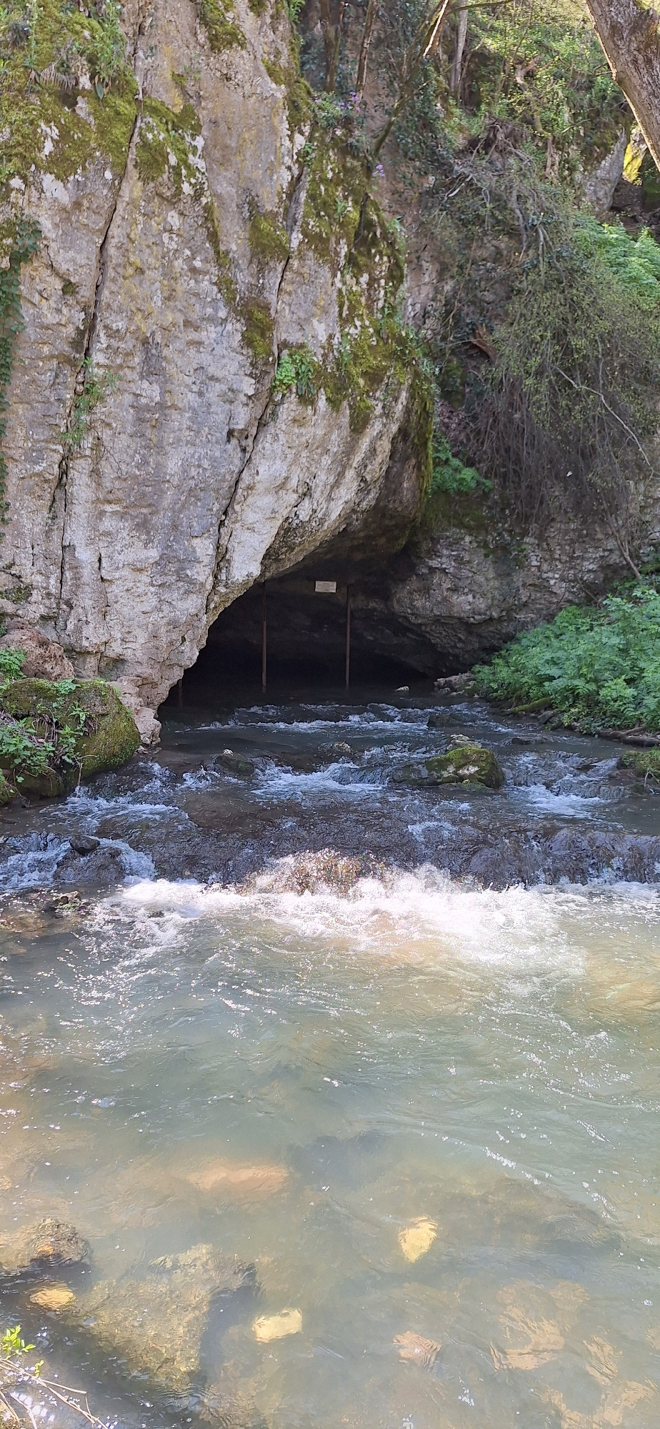 A horizontal, eye-level shot shows a water source flowing out of a cave formation in Krushuna, Bulgaria. The cave entrance is flanked by moss-covered rocks and vegetation. A set of wooden beams are pl…read more