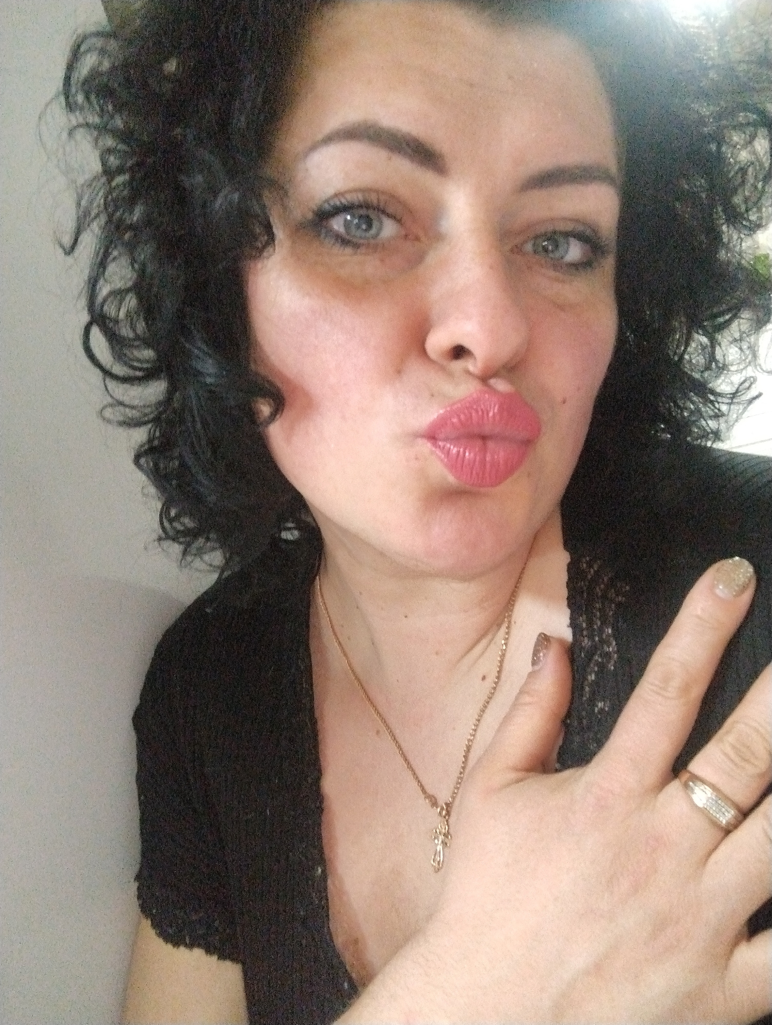 A woman is depicted in a close-up selfie, looking directly into the camera with a playful expression, her lips puckered into a kissing pose. She has dark, curly hair and striking blue-gray eyes, enhan…read more