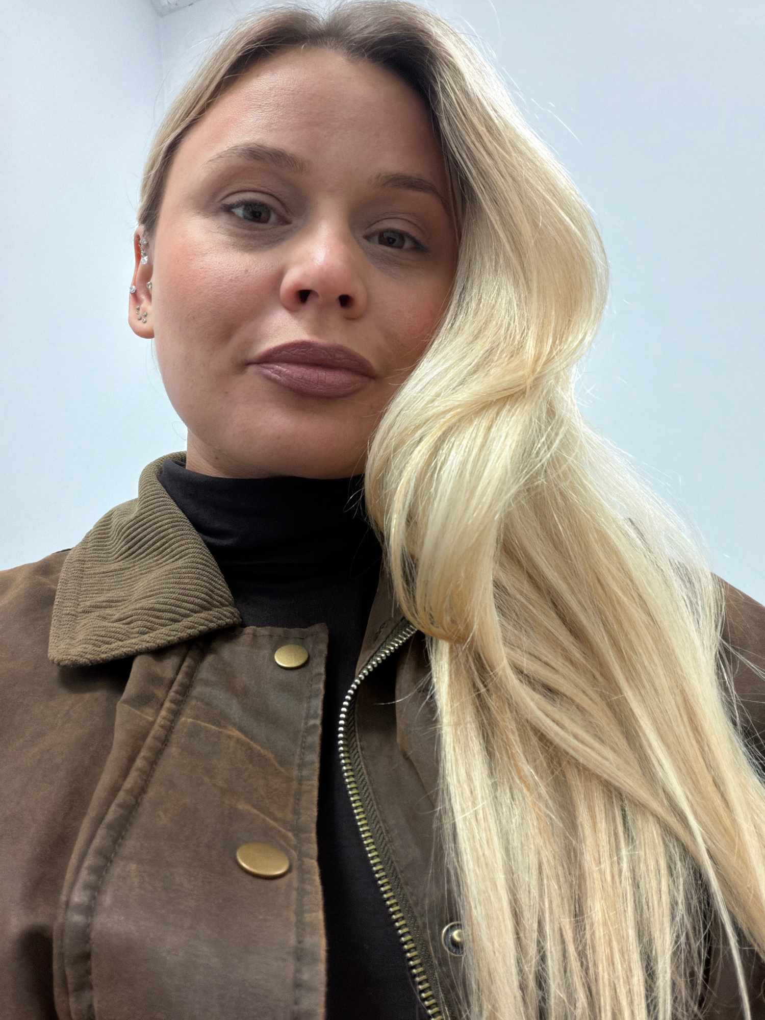A portrait shot of a woman with long blonde hair and light skin. She is wearing a black turtleneck and a brown jacket with a corduroy collar and brass buttons. The background appears to be a plain whi…read more