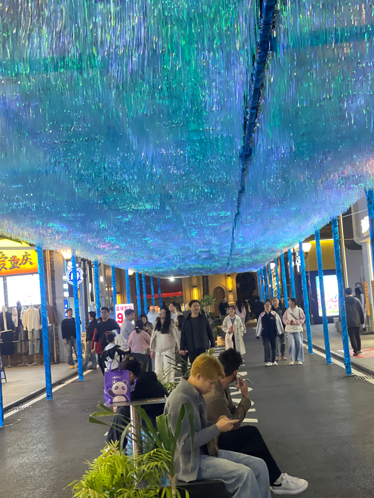 The scene depicts a pedestrianized street located within the Chongqing High-tech Zone, China, at night. An extensive overhead canopy, composed of dense, shimmering blue and green iridescent strips, sp…read more