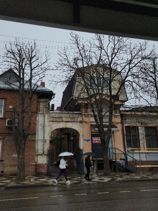 The image depicts an urban street scene on Pushkina Street, house number 44, in Krasnodar, Russia, under an overcast sky. The view is captured from a slightly elevated position, looking down onto a we…read more