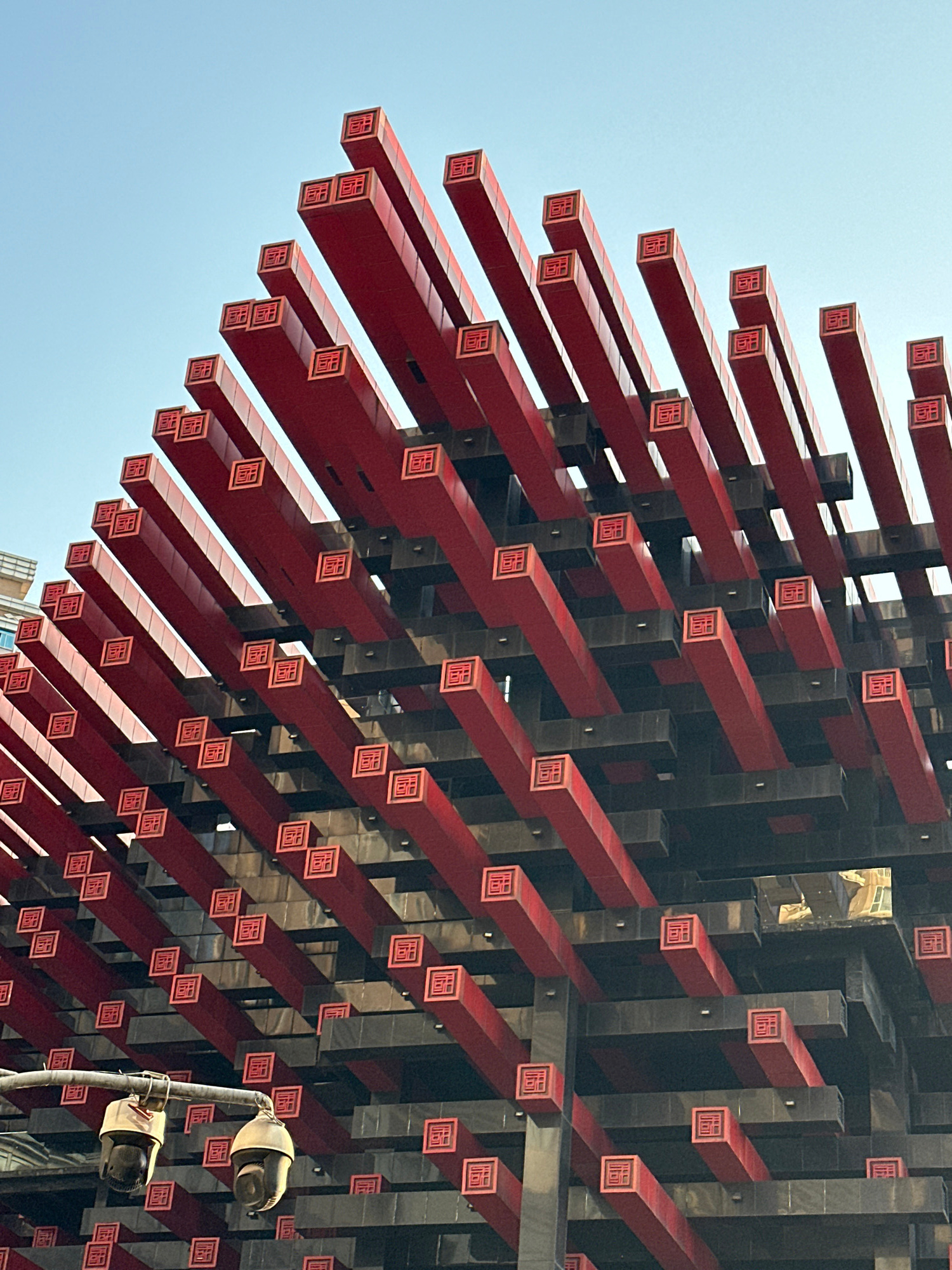 The image depicts a portion of the Raffles City Chongqing complex in Yuzhong District, China. The structure features a grid-like design composed of red and black rectangular beams, each adorned with a…read more