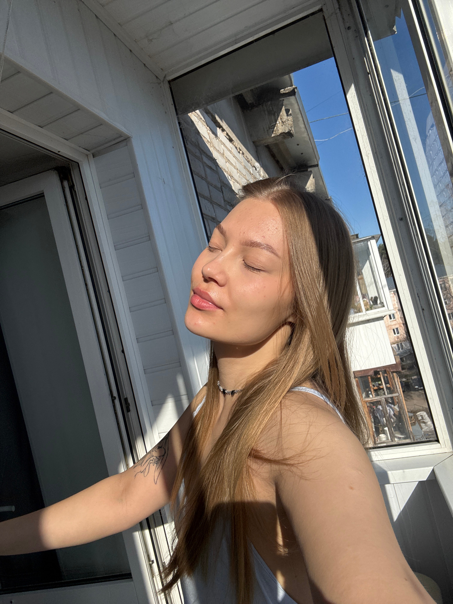 A young woman with light brown hair and closed eyes is the central subject, appearing to be resting or sunbathing. Her head is tilted upwards, and her lips are slightly parted in a relaxed expression.…read more