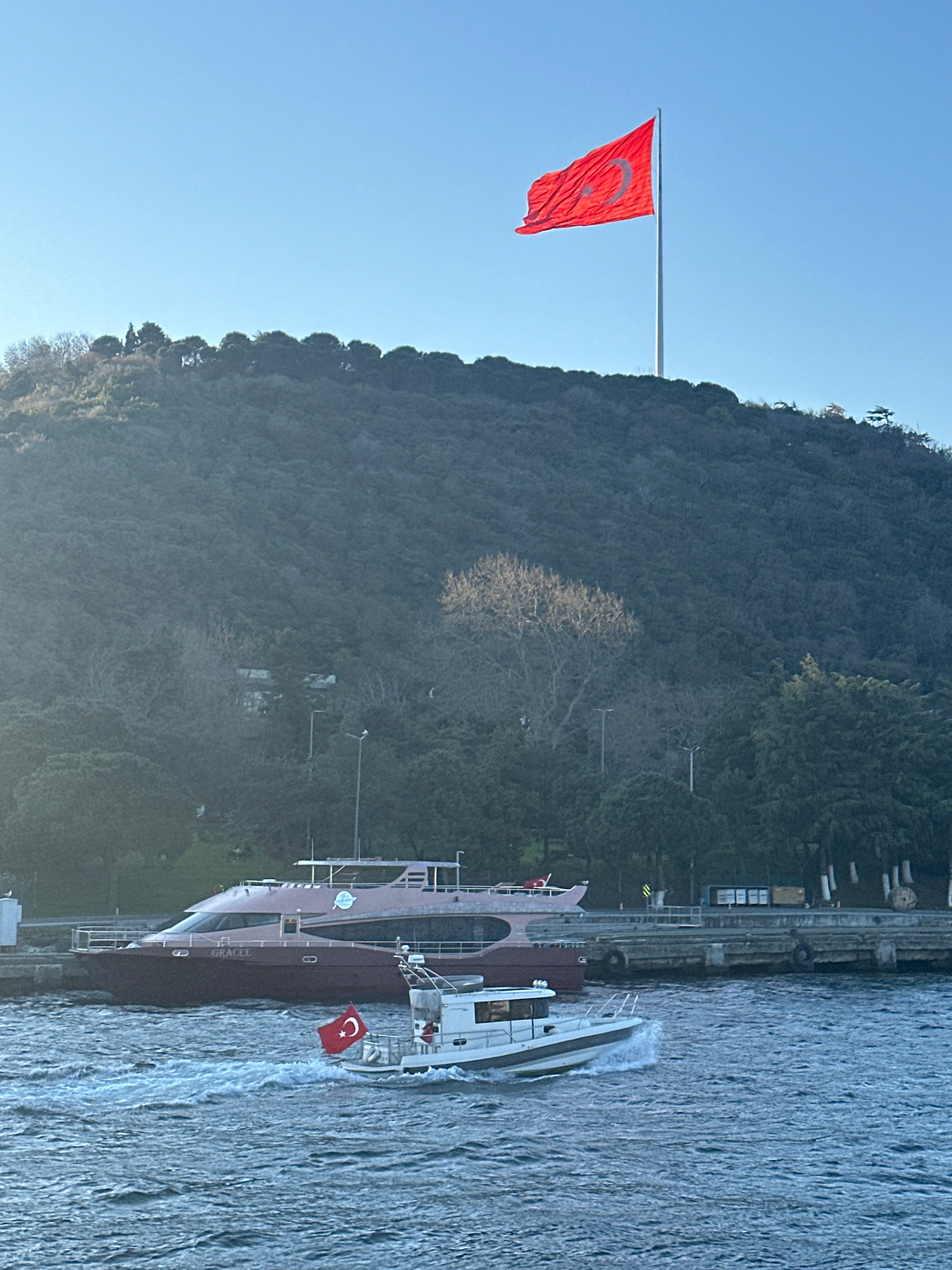 A slightly tilted outdoor shot shows a Turkish flag waving on a tall pole with a forested hillside in the background under a clear sky. To the right, a passenger ferry, also displaying a Turkish flag,…read more