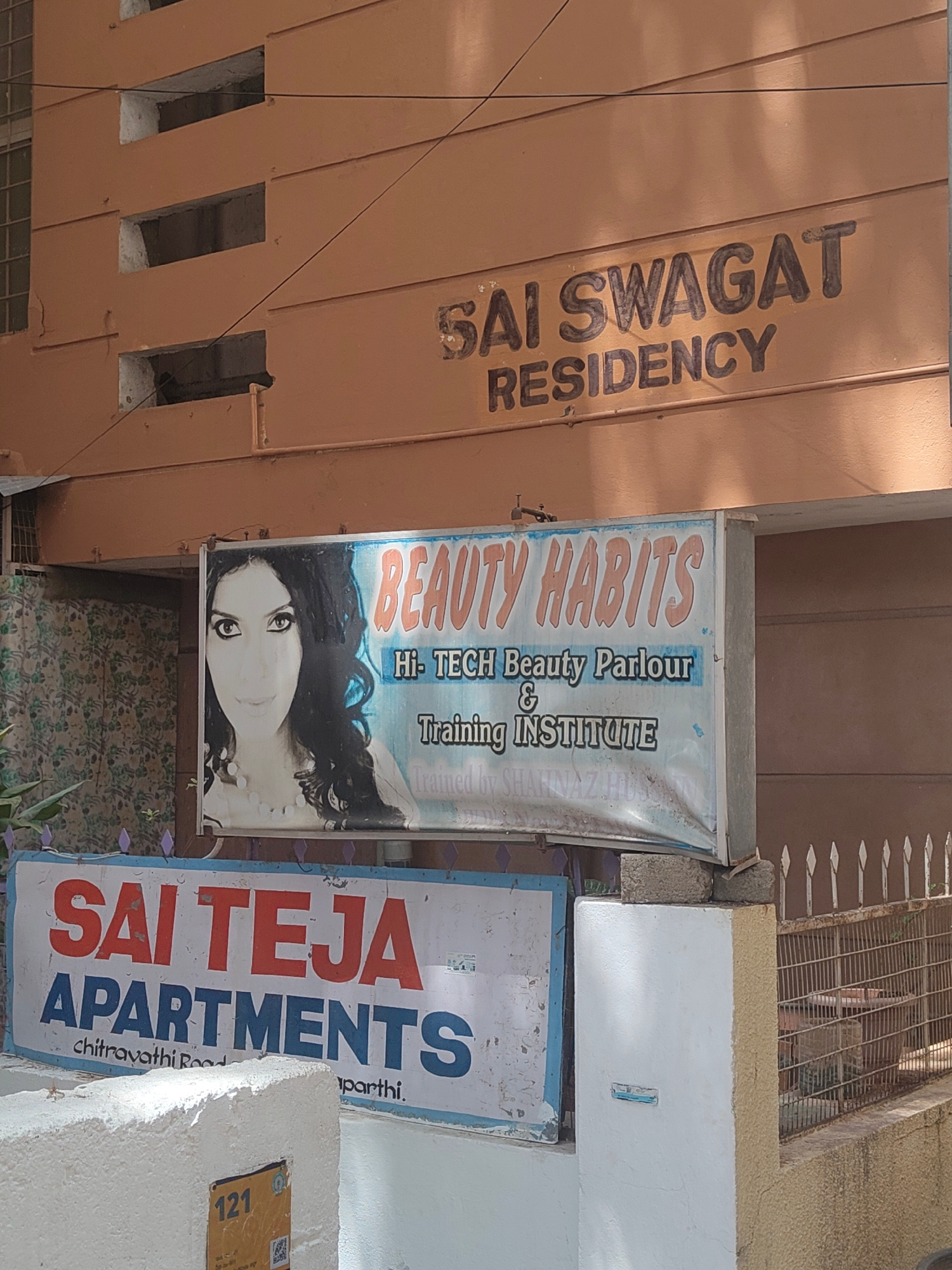 The image depicts the exterior of a building in Puttaparthi, India. The building's signage identifies it as "Sai Swagat Residency." Beneath this, signs for "Beauty Habits," a beauty parlor and trainin…read more