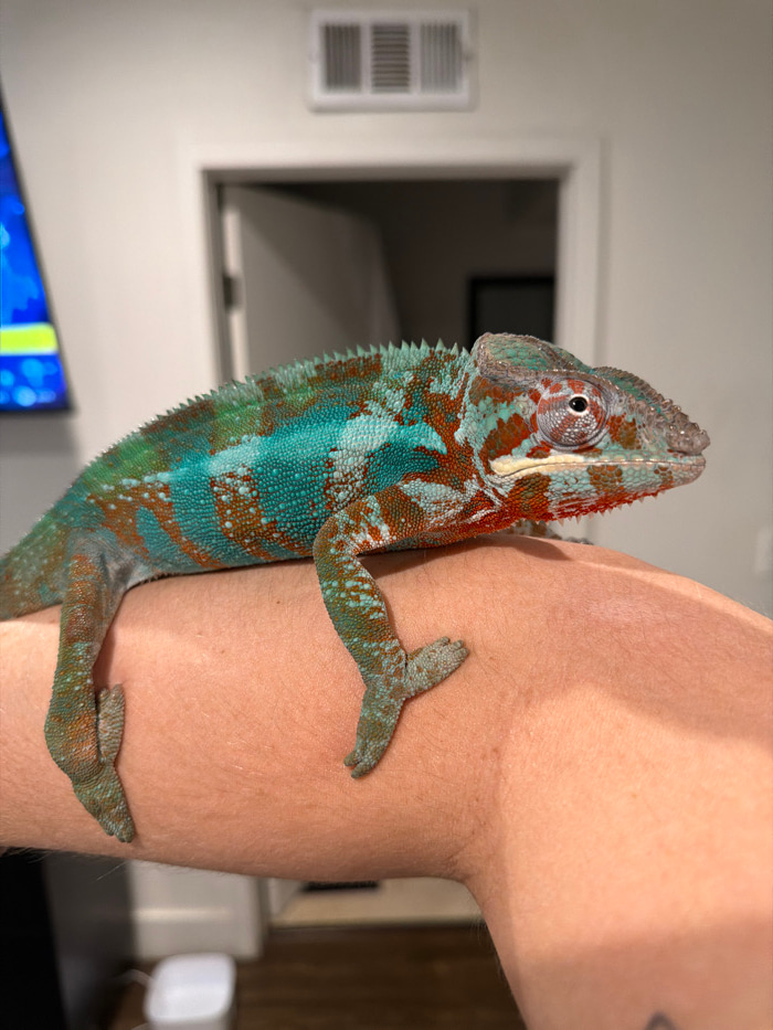 An adult male Panther Chameleon, exhibiting vibrant turquoise, green, red, and orange coloration with scattered light blue tubercles, is perched on the bare forearm of a person. The chameleon's head i…read more