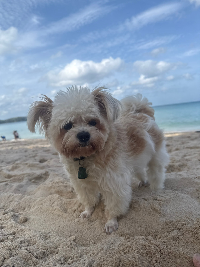 A fluffy, small, white and light brown dog lies on a sandy beach. It has dark eyes and a tag hanging from its collar. The beach extends behind the dog, with the ocean and sky visible in the background…read more