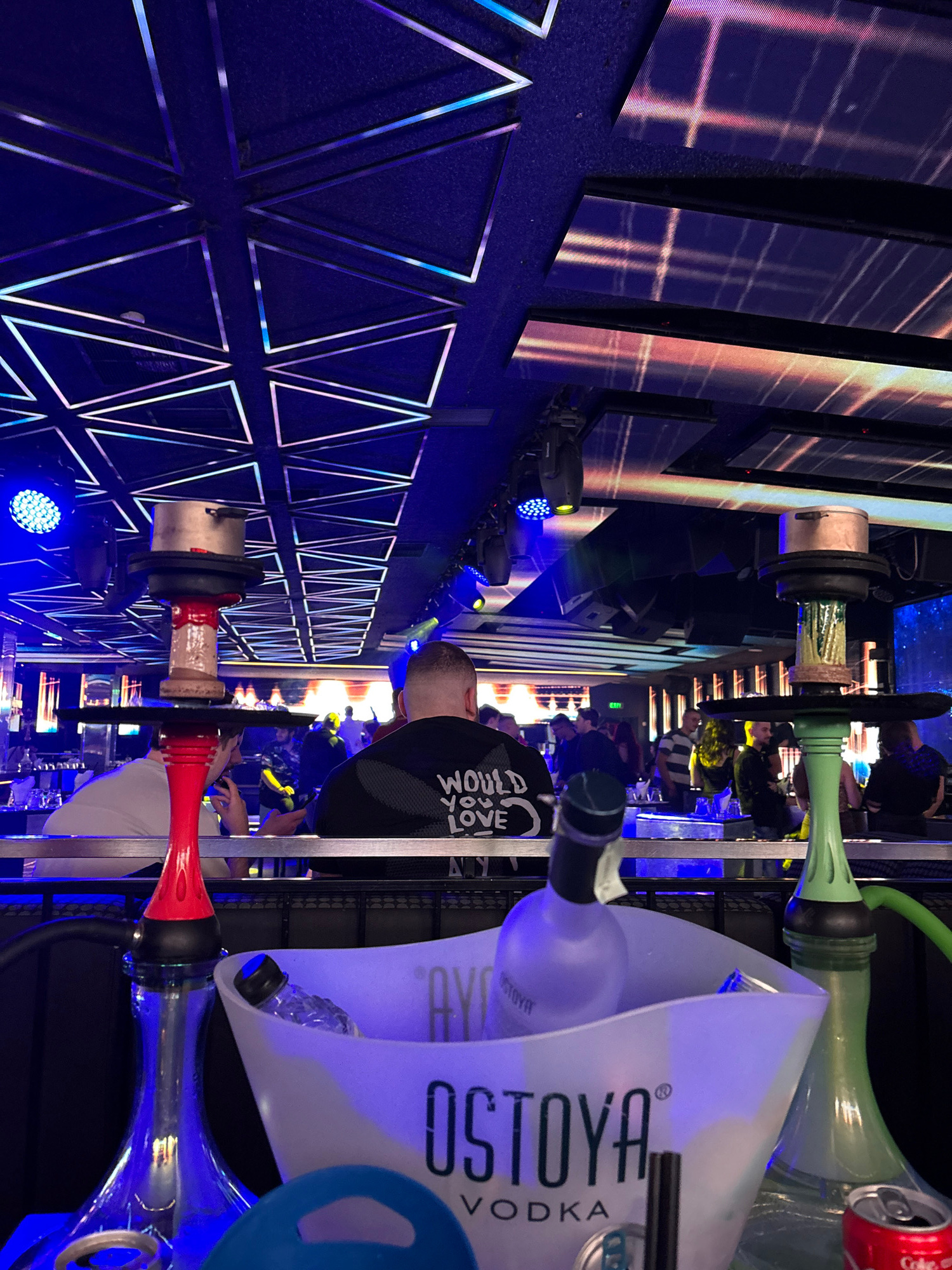 The image captures a vibrant, neon-lit club or bar scene at night in Sofia, Bulgaria. The setting is characterized by dynamic blue and purple lighting. In the foreground, several elaborate shisha (ho…read more
