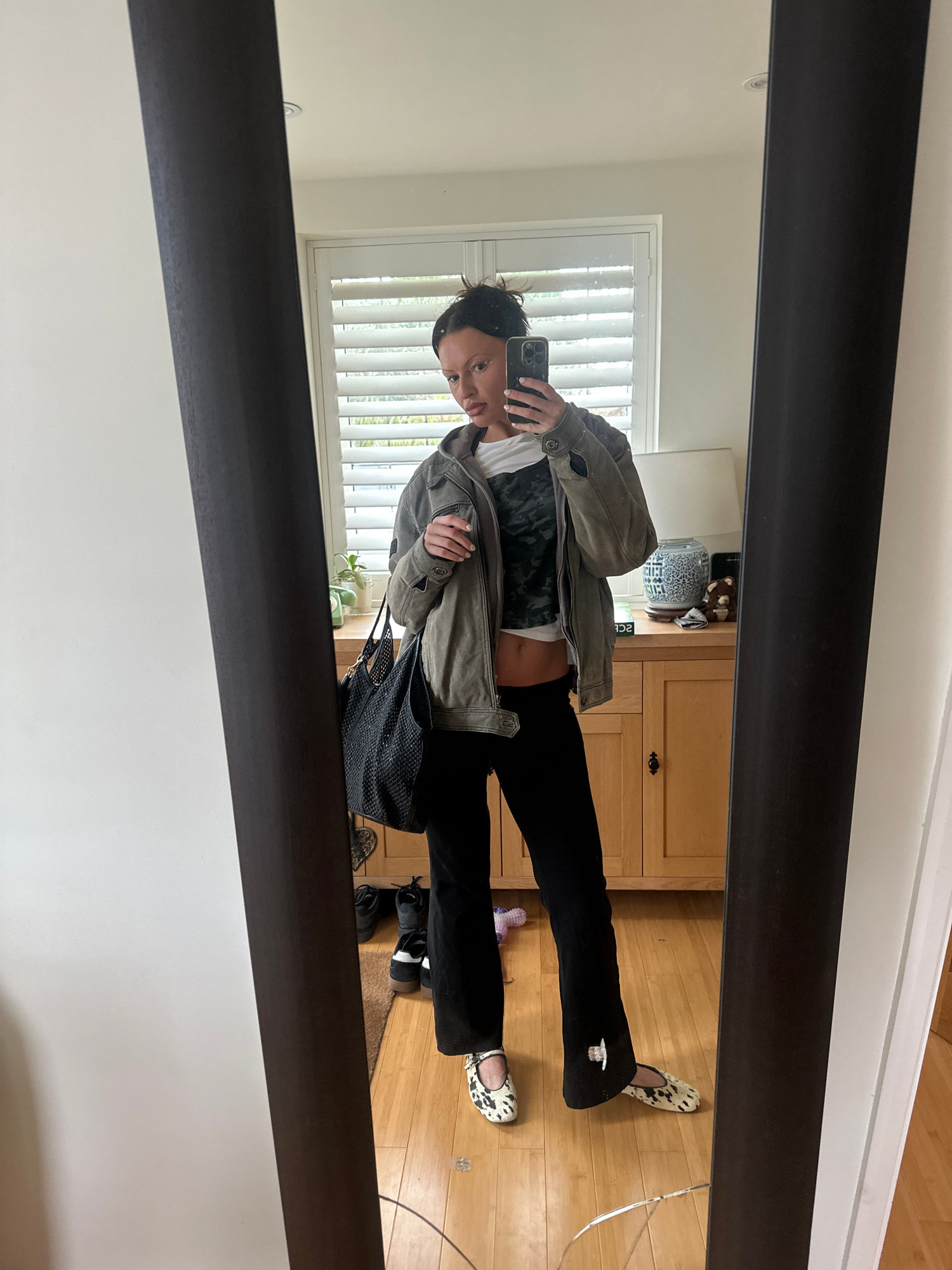 A full-length mirror selfie depicts an individual identified as a young adult female, located within an indoor domestic setting in Wealden, United Kingdom. The subject, positioned centrally, holds a dā¦read more