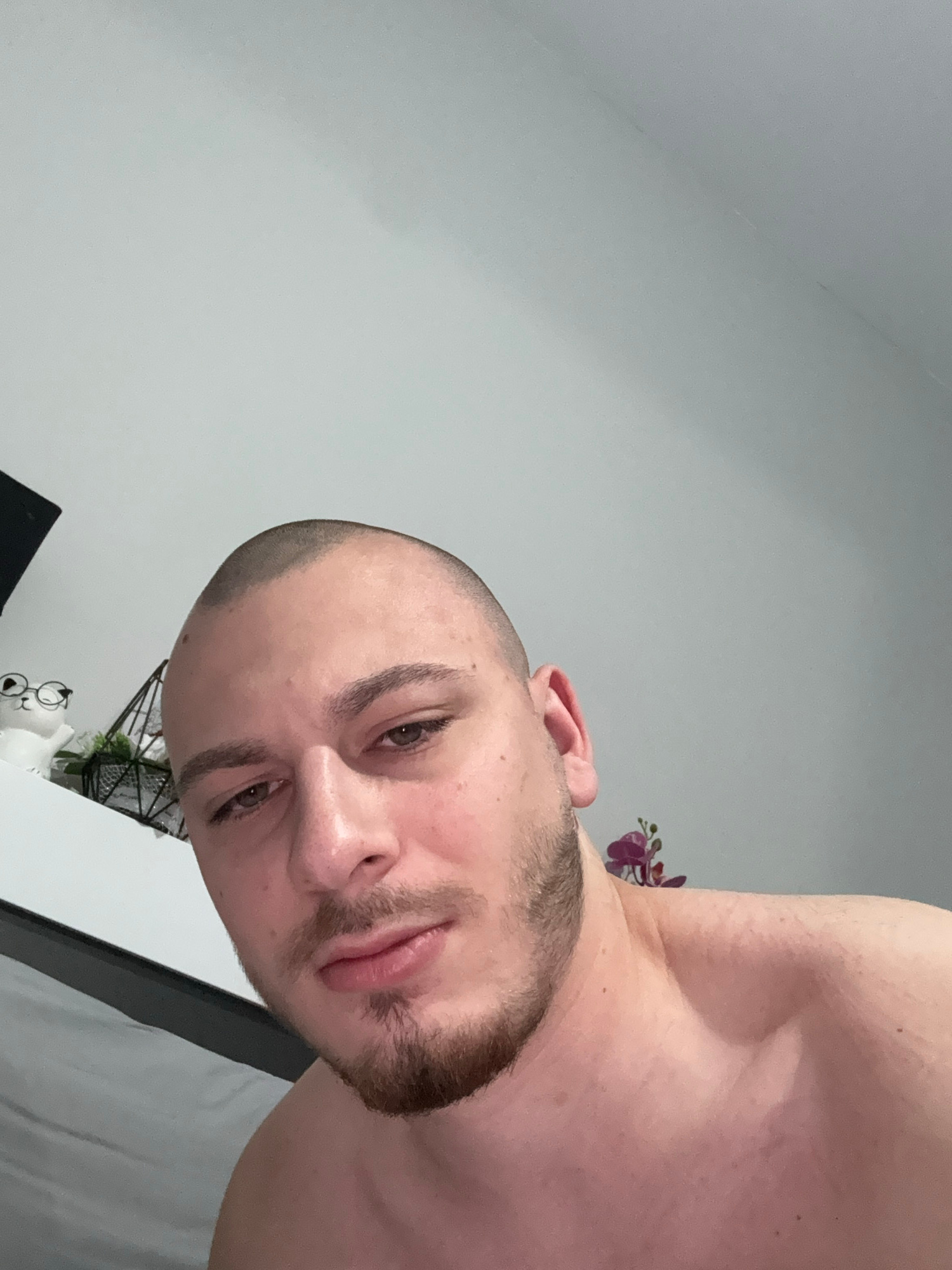 A close-up, slightly off-kilter, portrait-oriented photograph shows a man with a shaved head and a short beard. The man's face is the primary focus, with his eyes, nose, and mouth clearly visible. His…read more