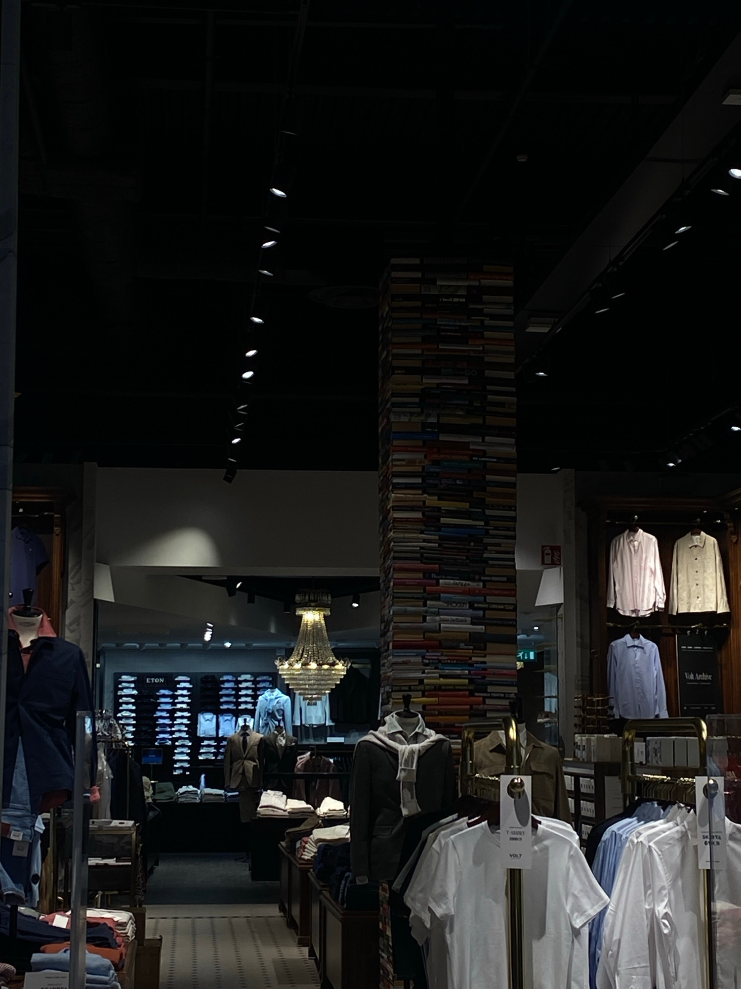 The image shows the interior of a shop, possibly located in Uppsala, Sweden. Racks of clothing, including shirts and t-shirts, are visible along with various displays. A chandelier is present, suggest…read more