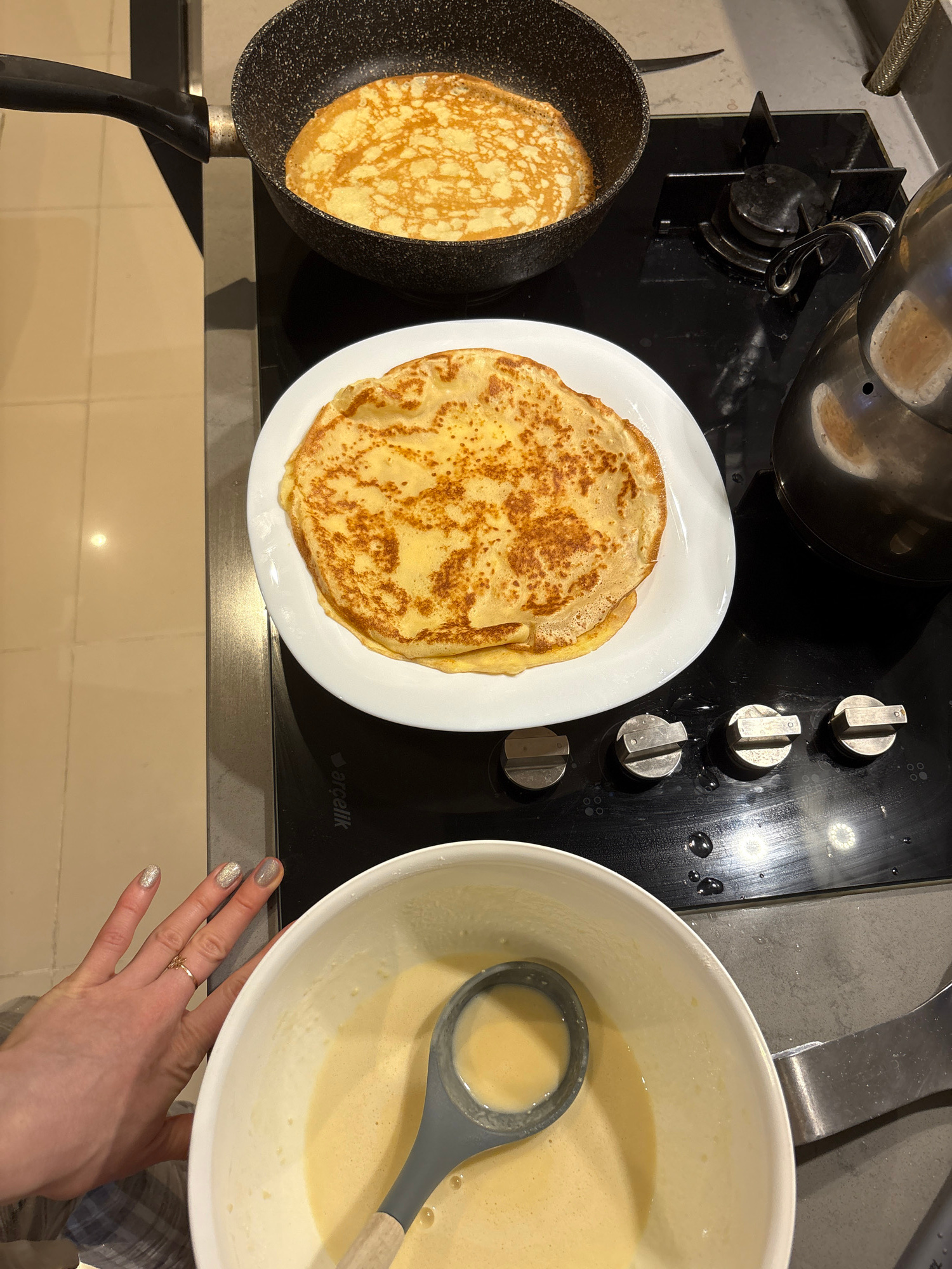 A top-down view shows a cooking scene, likely in a domestic kitchen. A black stovetop is the central feature. On the stovetop, from left to right: a frying pan with a pancake cooking inside; a white p…read more
