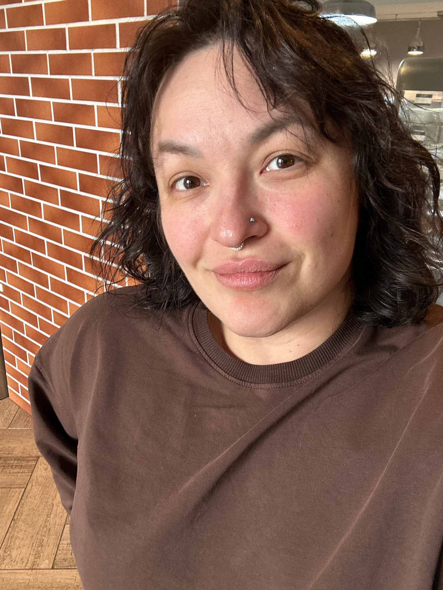 A selfie of a person with dark, wavy hair, light skin, and brown eyes. They have a nose piercing on the left side and are wearing a brown t-shirt. The background consists of an orange brick wall on th…read more
