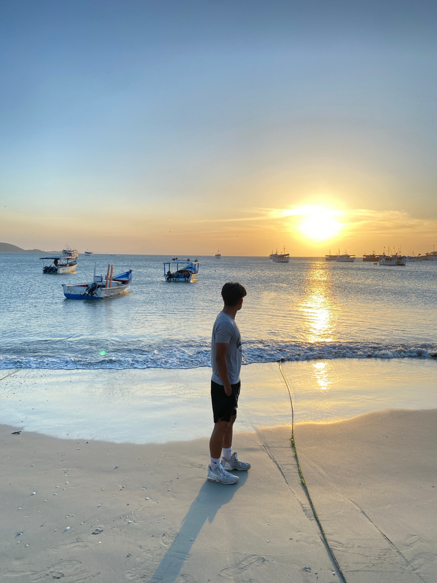 A vertical, eye-level shot captures a man standing on a sandy beach in Juan Griego, Venezuela. He is facing the sea with his back to the camera. The man is wearing a light-colored t-shirt, dark shorts…read more