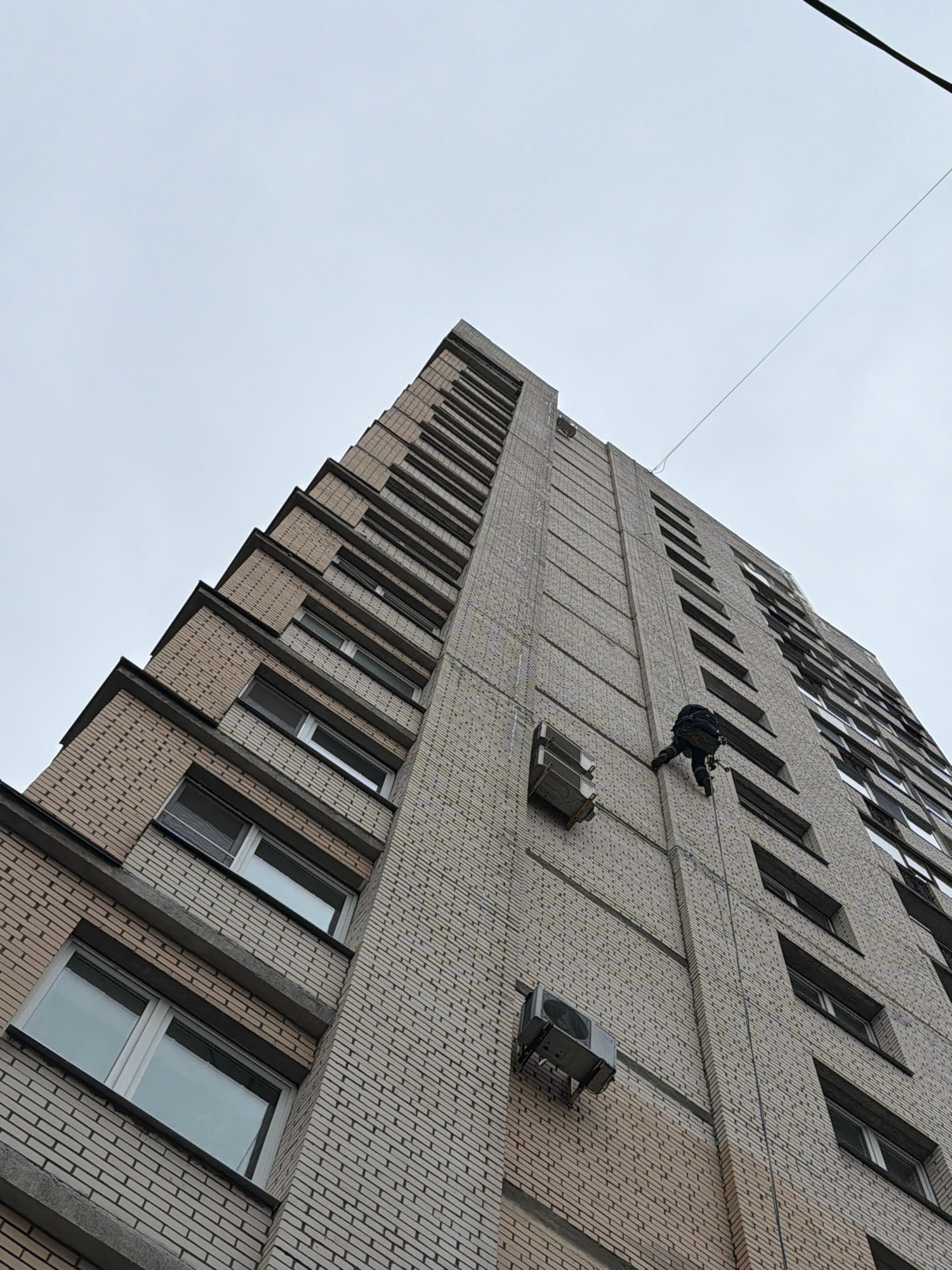 A low-angle shot captures a tall building in Saint Petersburg, Russia, with a worker rappelling down the exterior. The building has a light-brick facade with repetitive window patterns and jutting, ho…read more