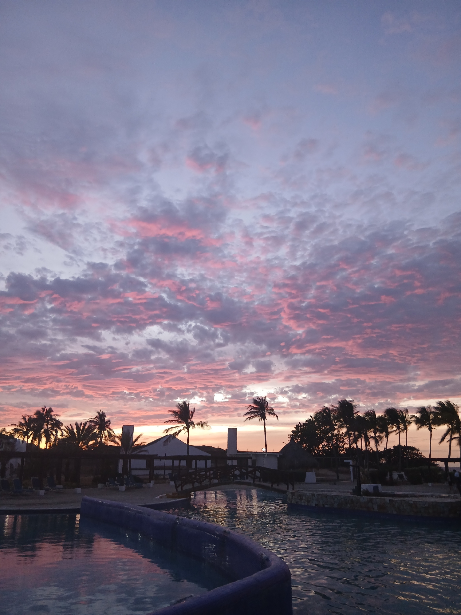 The image shows a dusk or dawn scene near a body of water, possibly a pool, with palm trees lining the edge. The sky is filled with textured clouds colored in shades of pink and gray, indicating eitheβ¦read more